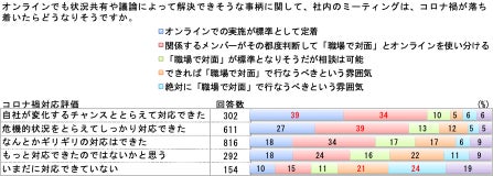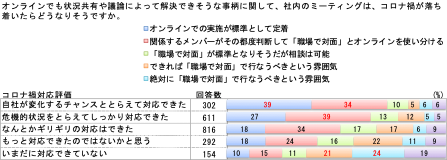 今後のミーティング方法について、「職場で対面」で行なうか、オンラインで行なうかを「その都度判断して使い分ける」という割合が3割あったことからは、思考の柔軟性が感じられました。今後は、人が集まってするべきことは何か、集まって意味があったか、が問われる時代になりそうです。