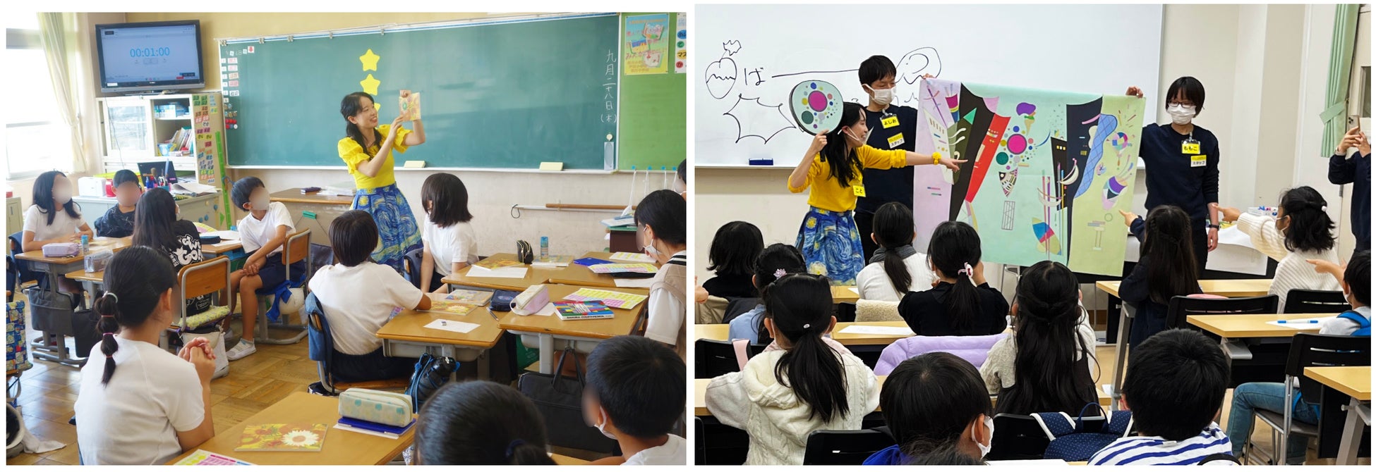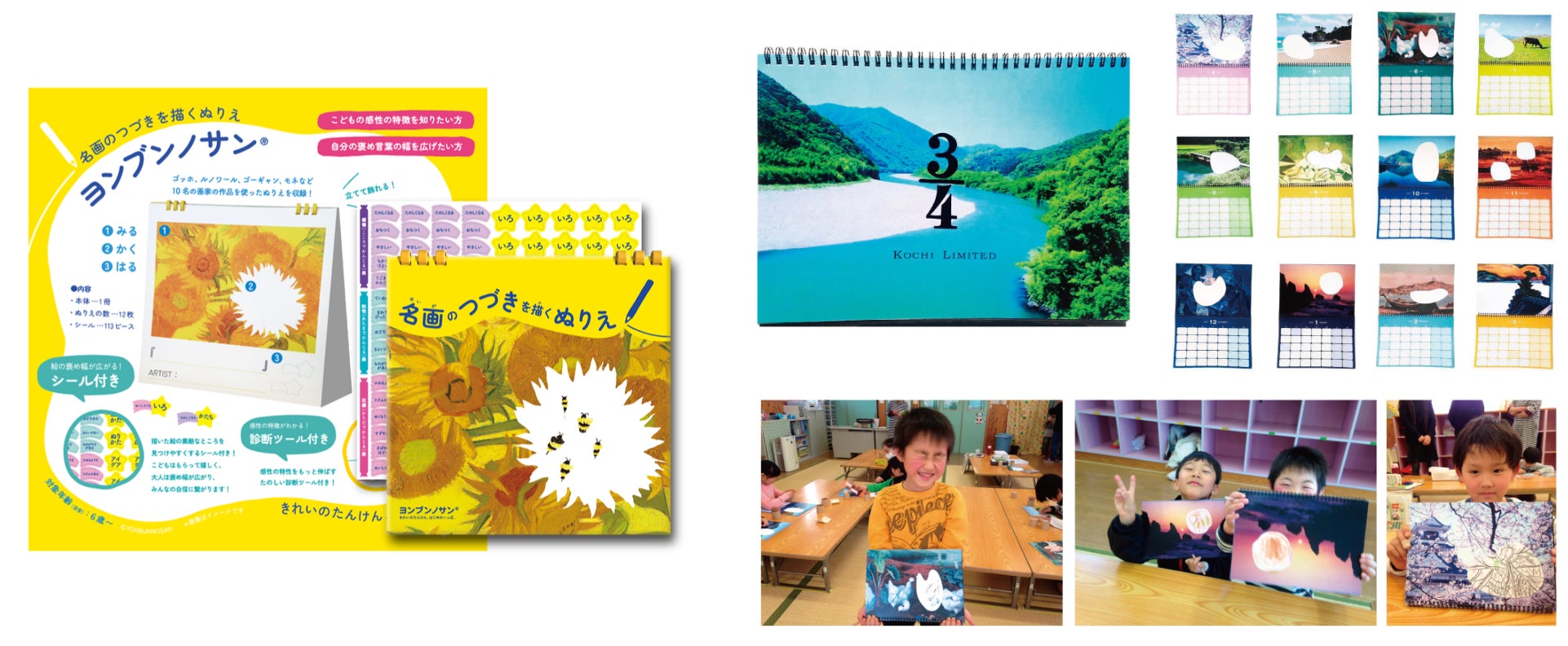 名画の一部が欠けたぬりえ『ヨンブンノサン』を中心としたアート知育玩具開発をはじめとし、企業や保育園、小学校でワークショップを多数開催しています。