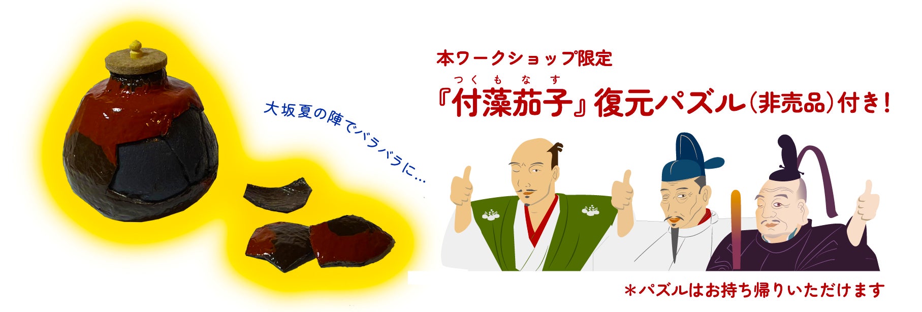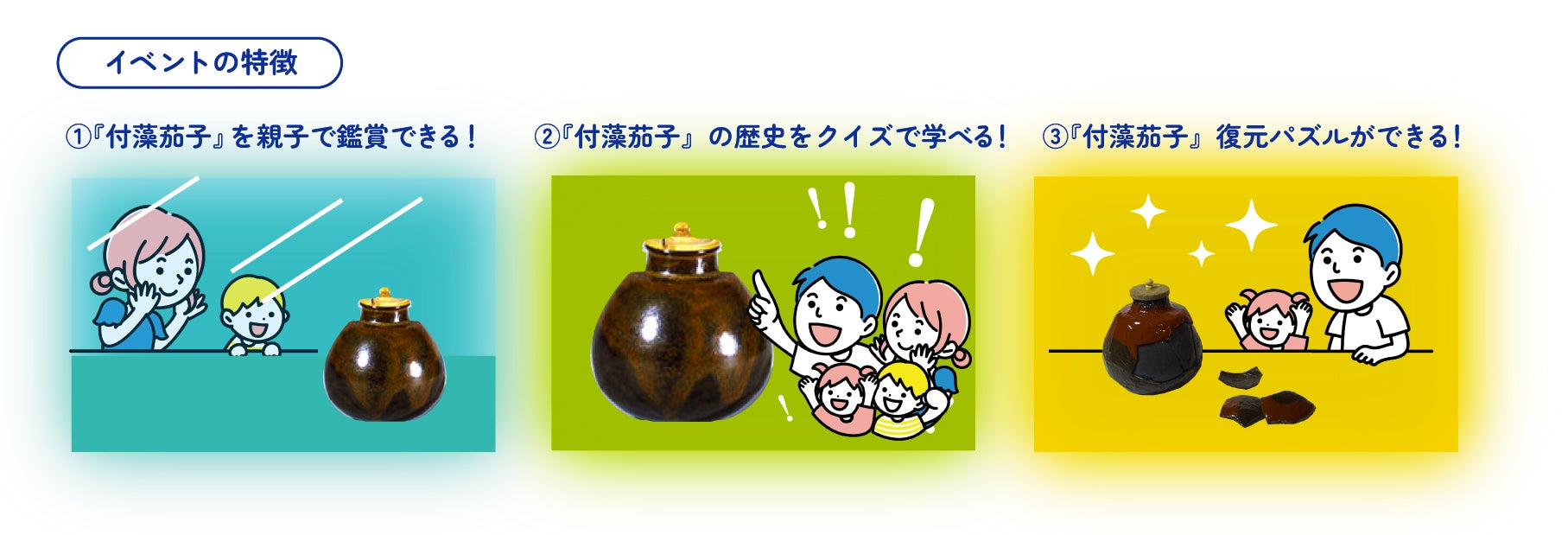 このイベントでは、大名物『付藻茄子』実物を親子で鑑賞できるほか、付藻茄子の歴史をクイズで知ることができ、さらに本ワークショップ限定の『付藻茄子』 復元パズル(非売品)を通して修正技術を擬似体験することができます 。
