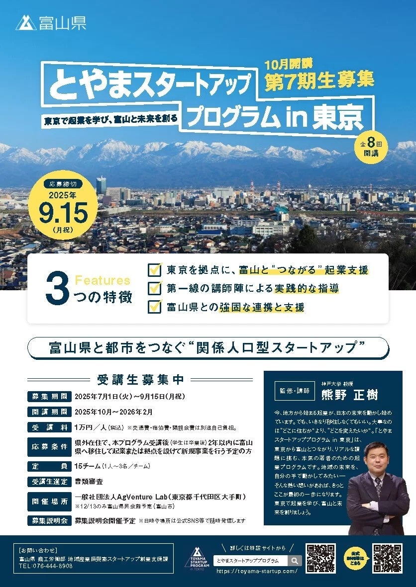 富⼭県で起業&スタートアップを志す皆さんを全⼒応援するための富⼭県主催の起業家育成プログラム「とやまスタートアッププログラム in 東京」は、第7期生の募集を開始しました。