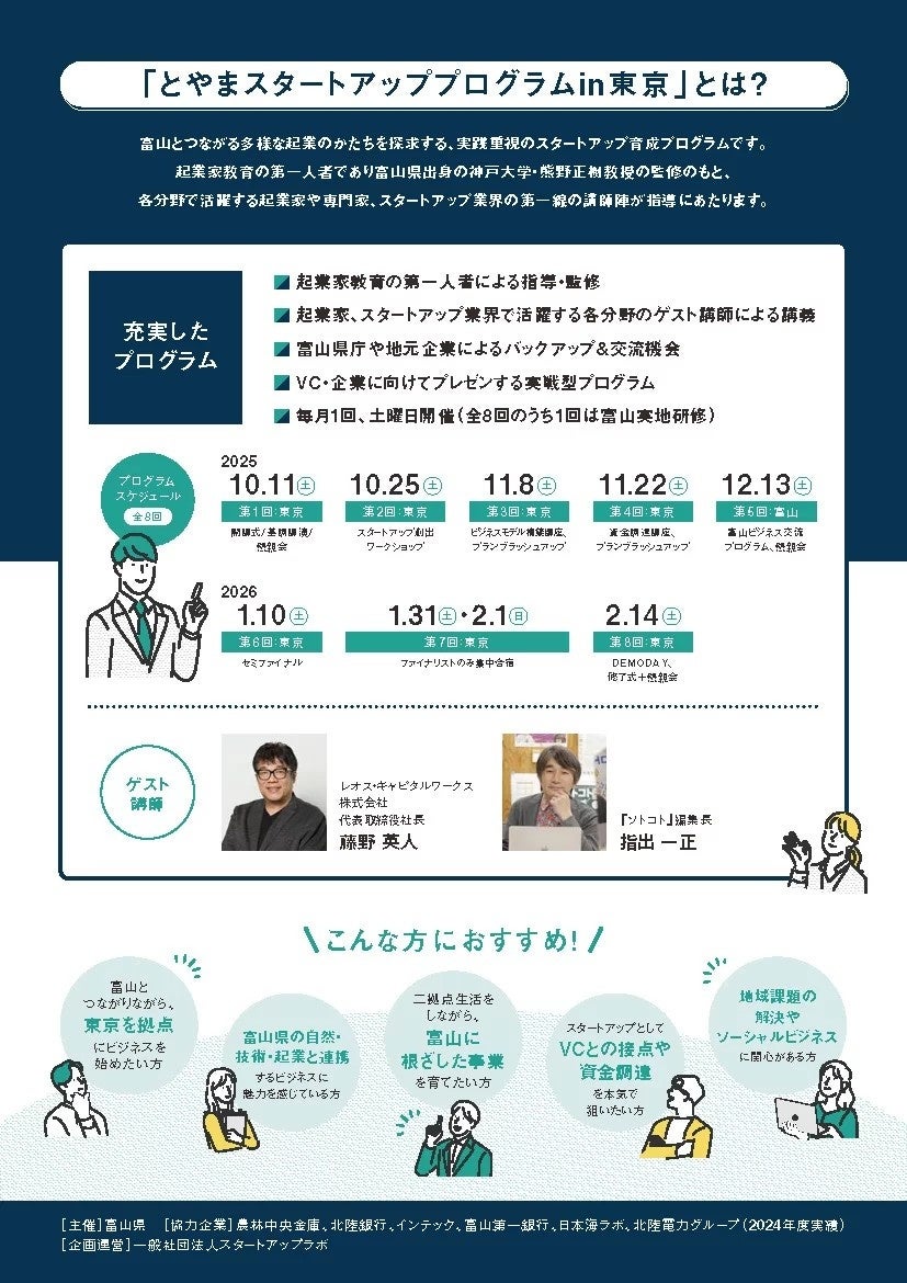 本プログラムは、「富山とつながるスタートアップの創出と育成」を目的に、関東圏に住む起業志望者・社会人・学生を対象とした、富山県が主催する実践型スタートアップ支援プログラムです。