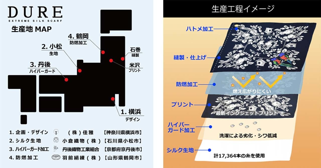 株式会社佳雅(よしまさ/神奈川県横浜市:代表取締役 遠藤敦史)が昨年スタートさせた国産シルク技術と横浜の歴史を掛け合わせたスカーフブランド、エクストリームシルクDuRē(デュレ)と、株式会社パル(本社:大阪府大阪市:代表取締役社長 松尾勇)が展開するレディースバッグブランドrusset(ラシット)は、高機能シルクスカーフの販売を2月下旬から開始いたします。