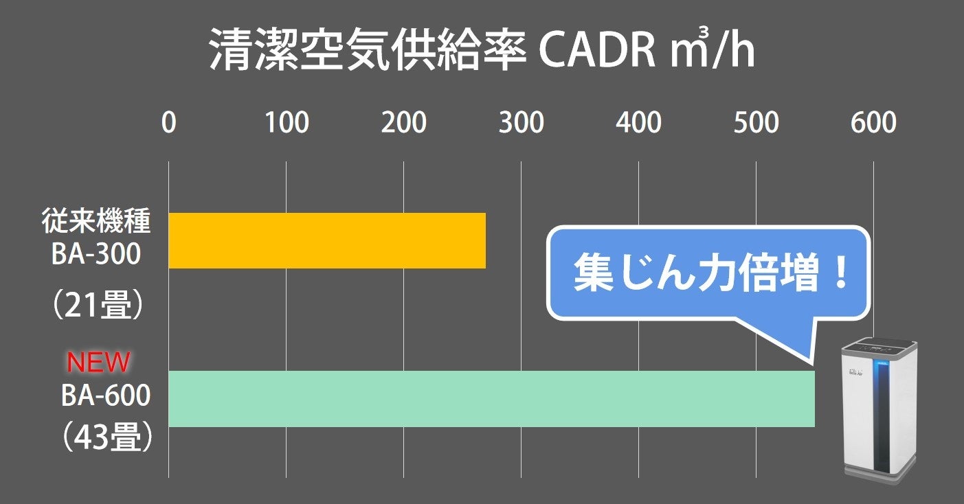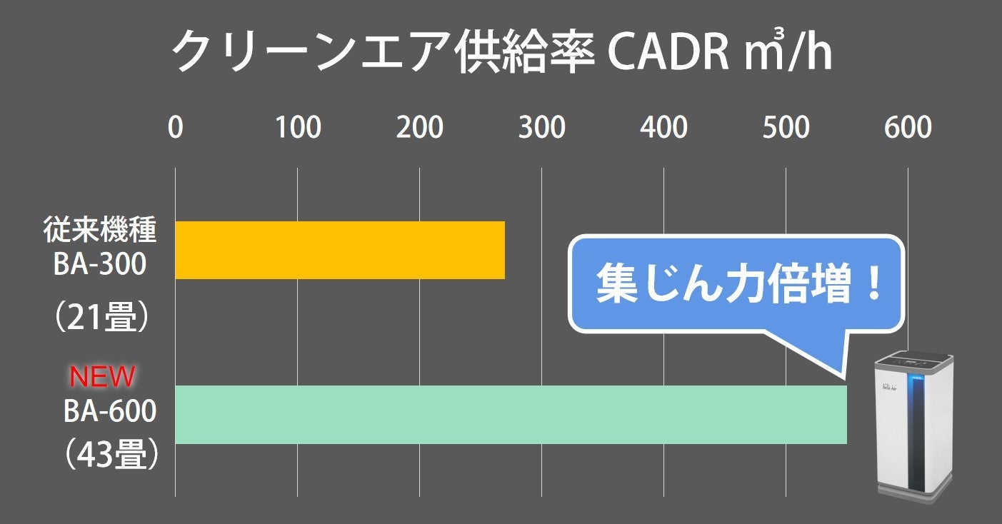 ※ BA-600のCADR値が550m3/hであり、適用床面積が43畳です。日本の家庭用空気清浄機規格JEM1467では、適用床面積が集じん能力に比例しており、また集じん能力の計算方法がCADRの計算方法とほぼ同じなので、適用床面積がCADRに比例することになります。