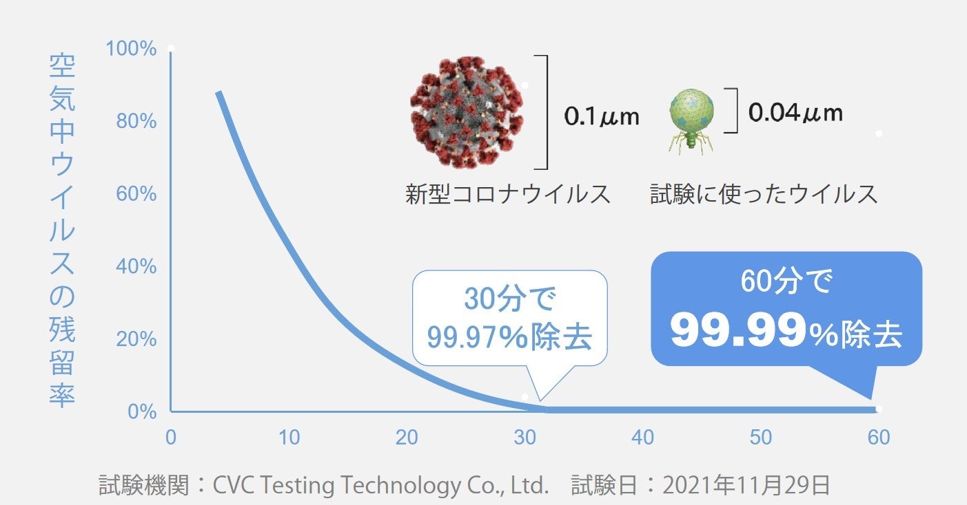 新型コロナウイルスより小さいウイルスを30分で99.97%、60分で99.99%除菌します。