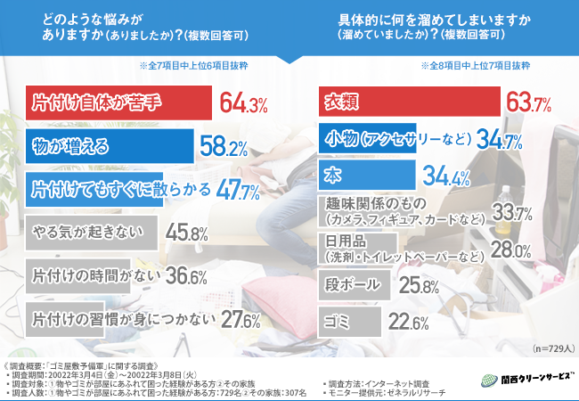 今回のアンケート調査では20代~50代の「物やゴミが部屋にあふれて困った経験がある方」729名の回答を得ることができ、片付けることに悩みを抱えている人が現役世代に少なくないことがわかりました。