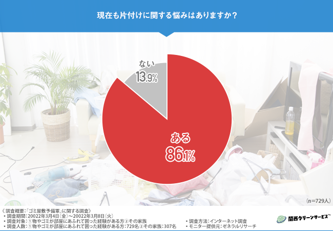 物やゴミが部屋にあふれて困った経験がある方に、「現在も片付けに関する悩みはありますか?」と質問したところ、8割以上の方が『ある(86.1%)』と回答しました。