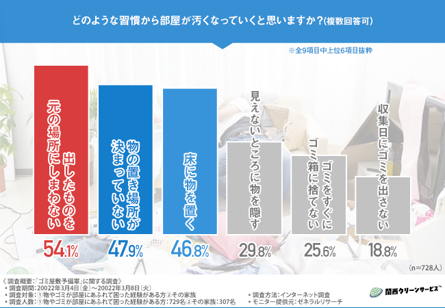 「どのような習慣から部屋が汚くなっていくと思いますか?(複数回答可)」と質問したところ、『出したものを元の場所にしまわない(54.1%)』と回答した方が最も多く、次いで『物の置き場所が決まっていない(47.9%)』『床に物を置く(46.8%)』『見えないところに物を隠す(29.8%)』『ゴミをすぐにゴミ箱に捨てない(25.6%)』『収集日にゴミを出さない(18.8%)』と続きました。