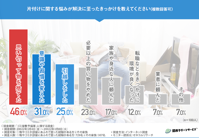 そこで、「片付けに関する悩みが解決に至ったきっかけを教えてください(複数回答可)」と質問したところ、『思い切って物を捨てた(46.0%)』と回答した方が最も多く、次いで『意識や習慣を変えた(31.0%)』『引越しをした(25.0%)』と続きました。