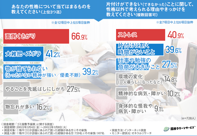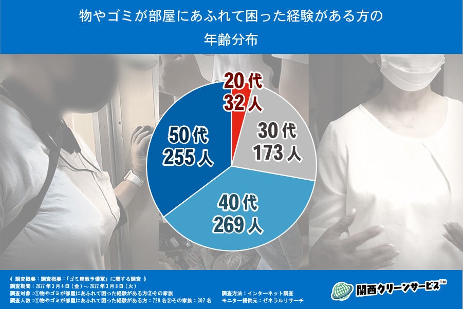 『関西クリーンサービス (所在地:大阪府大阪市)』を運営するA-LIFE株式会社(代表取締役:亀澤 範行)は、①物やゴミが部屋にあふれて困った経験がある方、②その家族を対象に、「ゴミ屋敷予備軍」に関する調査を実施しました。