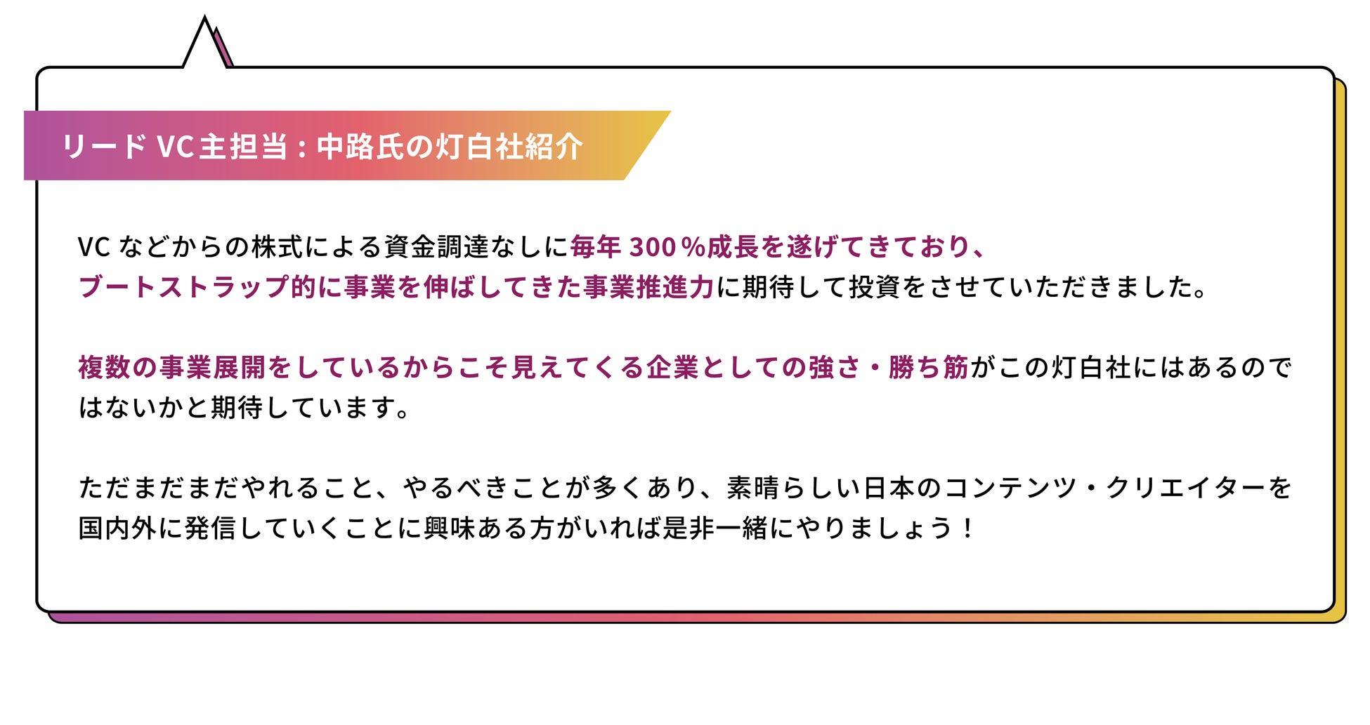 クリエイターや版権版元を中心にして、ファン経済圏の構築と活性化によりマルチメディア展開やオンライン、オフラインの垣根を超えた体験を届けるすることで、日本がグローバル水準にて独自のIP経済圏を構築拡大しつづけることができると考え、エクイティ調達を実施しました。