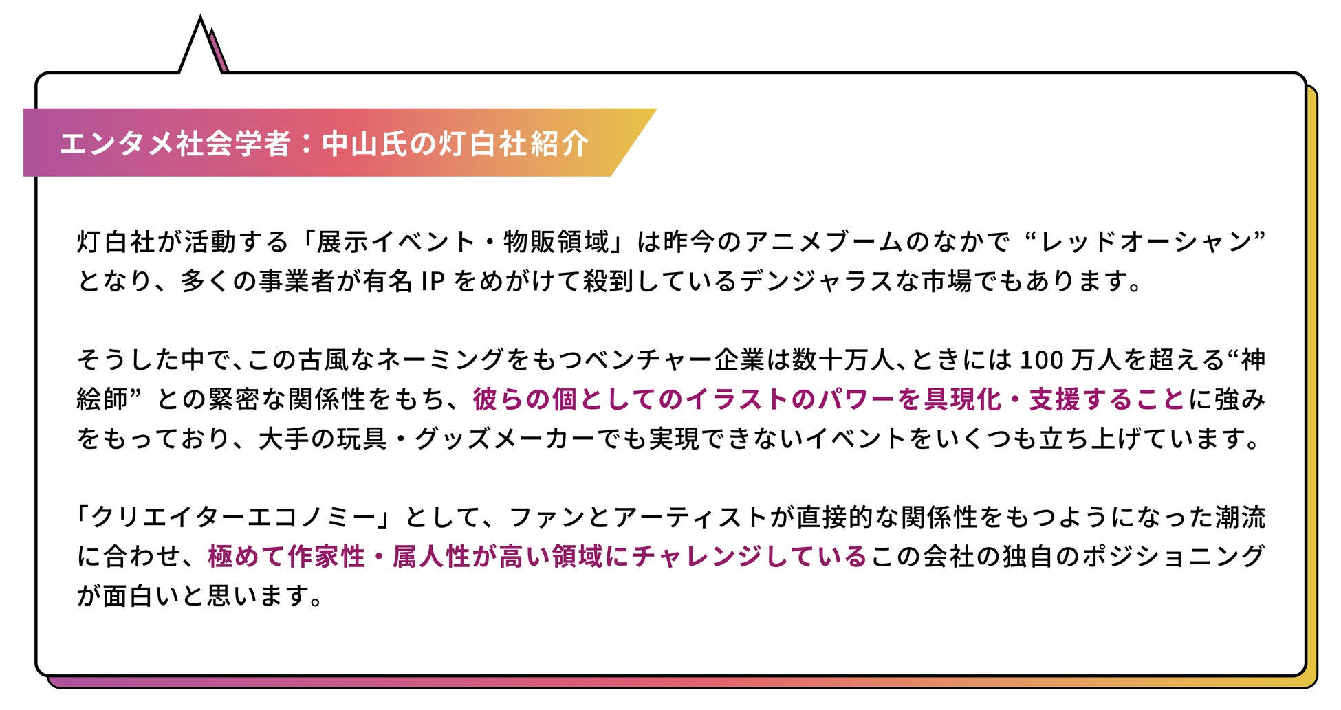 灯白社は、クリエイターやコンテンツの版元企業様のマーケティング活動及び物販領域において、単独では実現できない企画やアイテムを用いてオフライン・オンライン問わずに話題性のある企画を実現していきます。