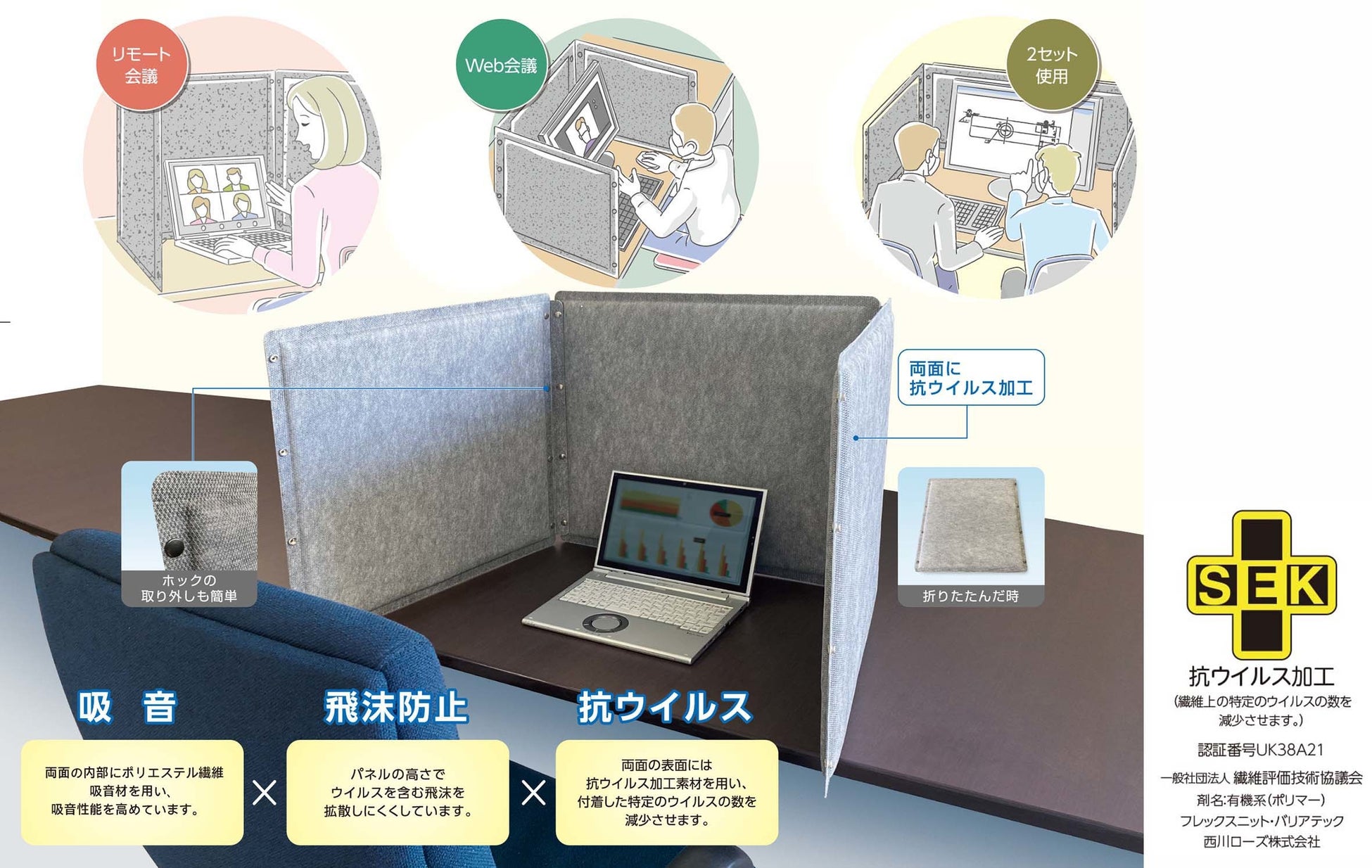 新型コロナ感染症対策としてテレワークやWeb会議等、非対面でコミュニケーションをとることが多くなった社会背景に対応すべく、デスク環境改善とウイルス対策による安全・安心な作業環境を提供するために、「防音」「抗ウイルス」を両立する「吸音パーテーション」の開発を行いました。
