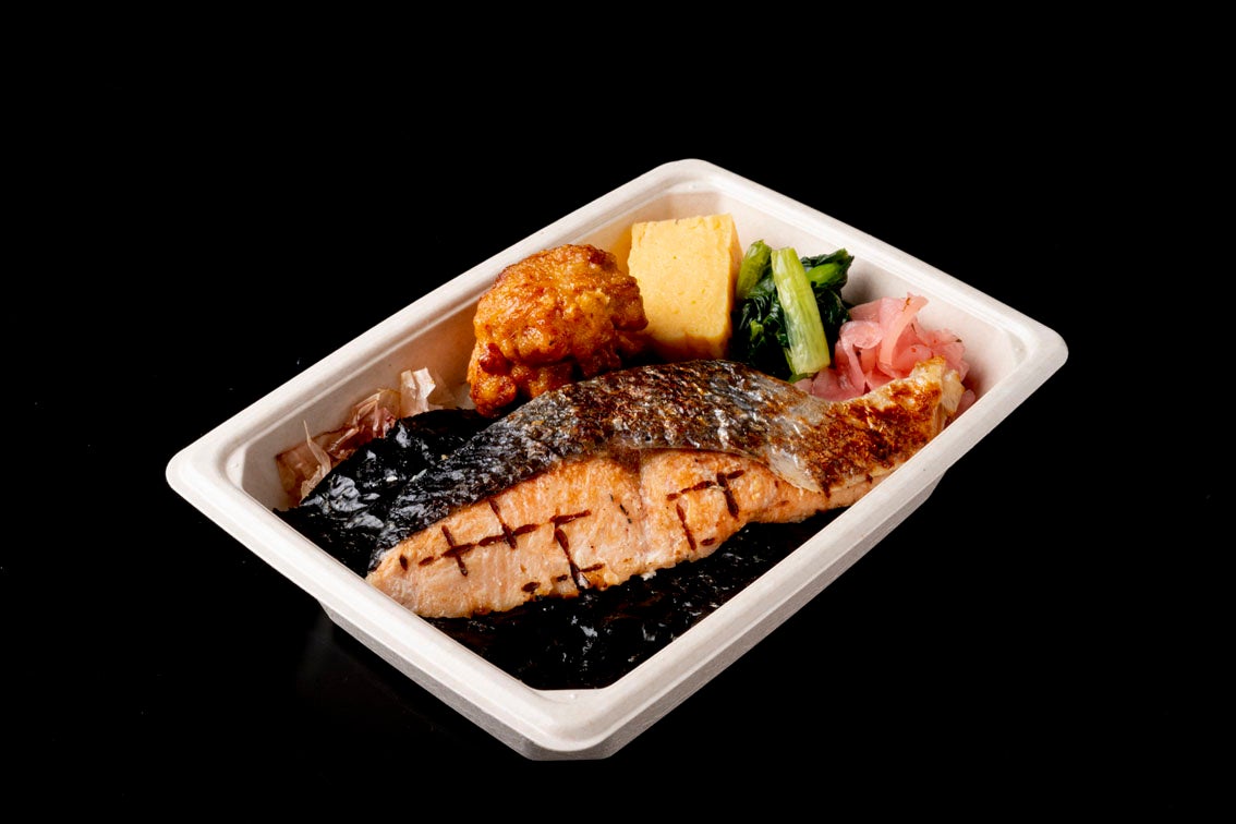 甘酒に漬けてふっくら焼いた天然秋鮭、有明の海苔、御前崎の手火山式鰹節、唐揚、玉子焼、漬物まで国産100%の本格海苔弁。