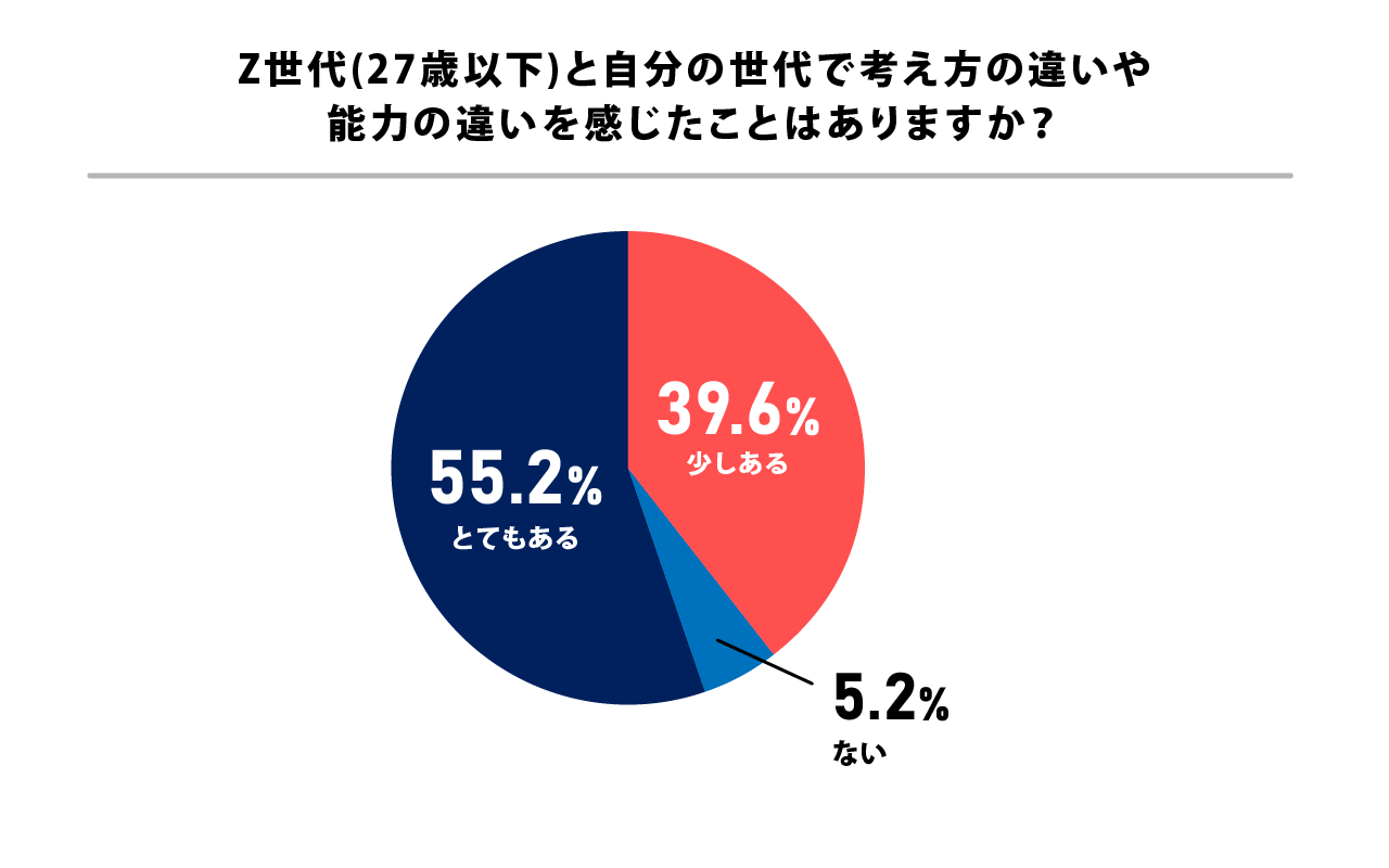 『Z世代(27歳以下)と自分の世代で考え方の違いや能力の違いを感じたことはありますか?』には「とてもある」が55.2%。「少しある」が39.6%で94.8%とほとんどの企業が考え方の違いや能力の違いを感じているという結果になりました。