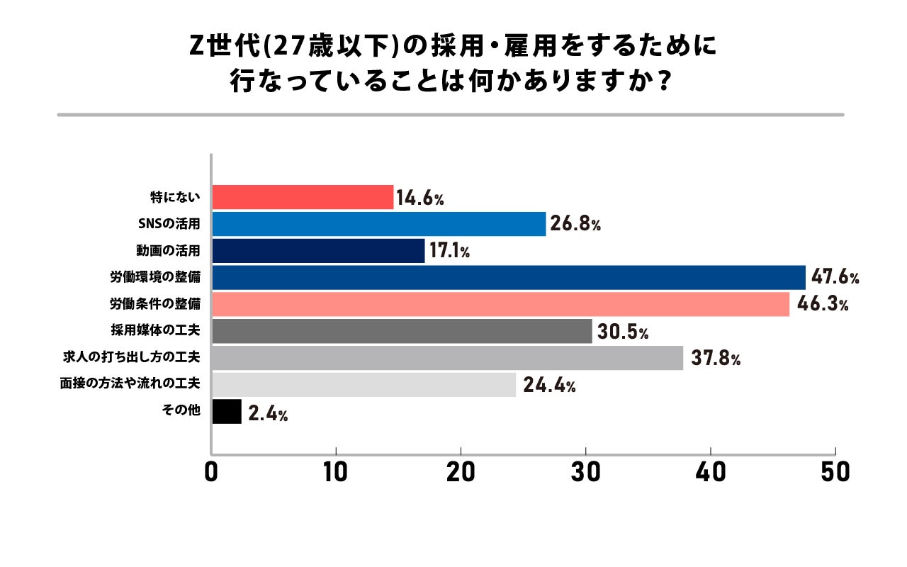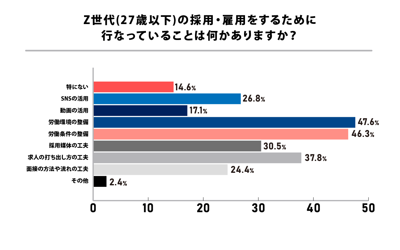 世代間のギャップでは様々な声が挙がる一方、Z世代の採用については90%以上の企業が「採用・雇用をしていきたい」と回答が得られました。では、実際に若手の採用・雇用を行うために、企業がどのような工夫をしているかが以下になります。
