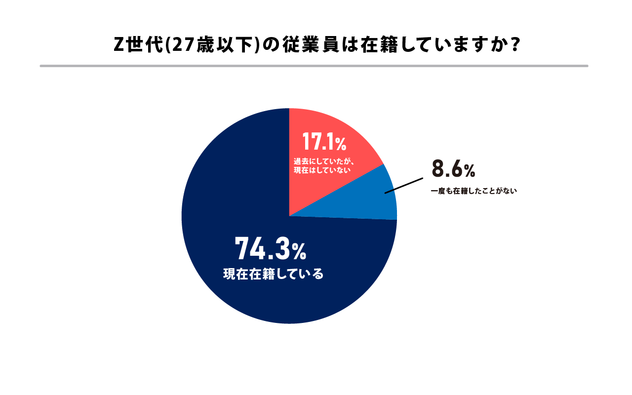 『Z世代(27歳以下)の従業員は在籍していますか?』の問いに対し、74.3%が「現在在籍している」と回答しました。17.1%の企業も「過去にしていたが、現在はしていない」と回答し、Z世代の雇用経験のある企業は全体の91.4%と9割を超える結果になりました。