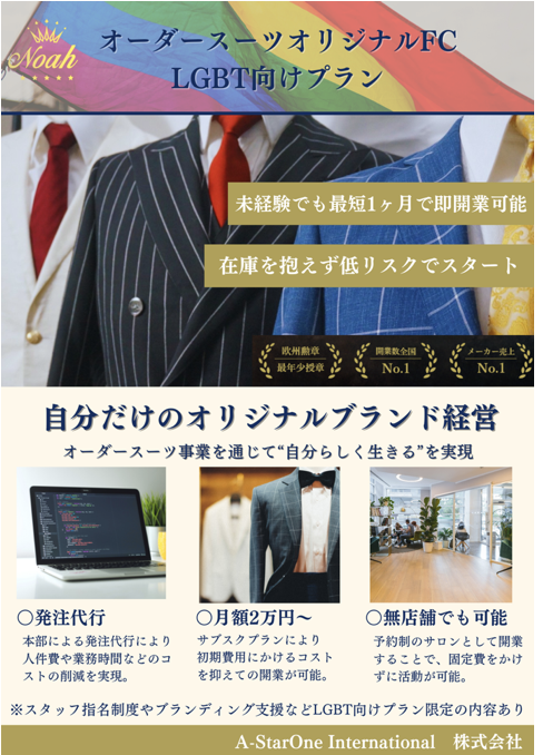 全国130ヶ所展開のオーダースーツNoah、並びにラグジュアリーオーダーシューズD2CブランドRioを展開するA-StarOne International株式会社(本社:東京都港区、代表:坂本大地)は新たに月額2万円〜の定額料金でオリジナルブランドを経営することが可能なLGBT向けFCプランをリリースしました。