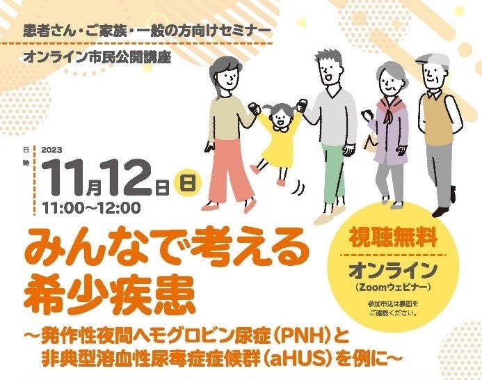 アレクシオンファーマ合同会社(本社:東京都港区、社長:笠茂公弘 以下「アレクシオンファーマ」)は、患者さんとご家族、一般の方を対象に、希少疾患の理解促進を目的とした市民公開講座「みんなで考える希少疾患」を、2023年11月12日(日)11:00~12:00、オンライン(参加費無料)にて開催します。