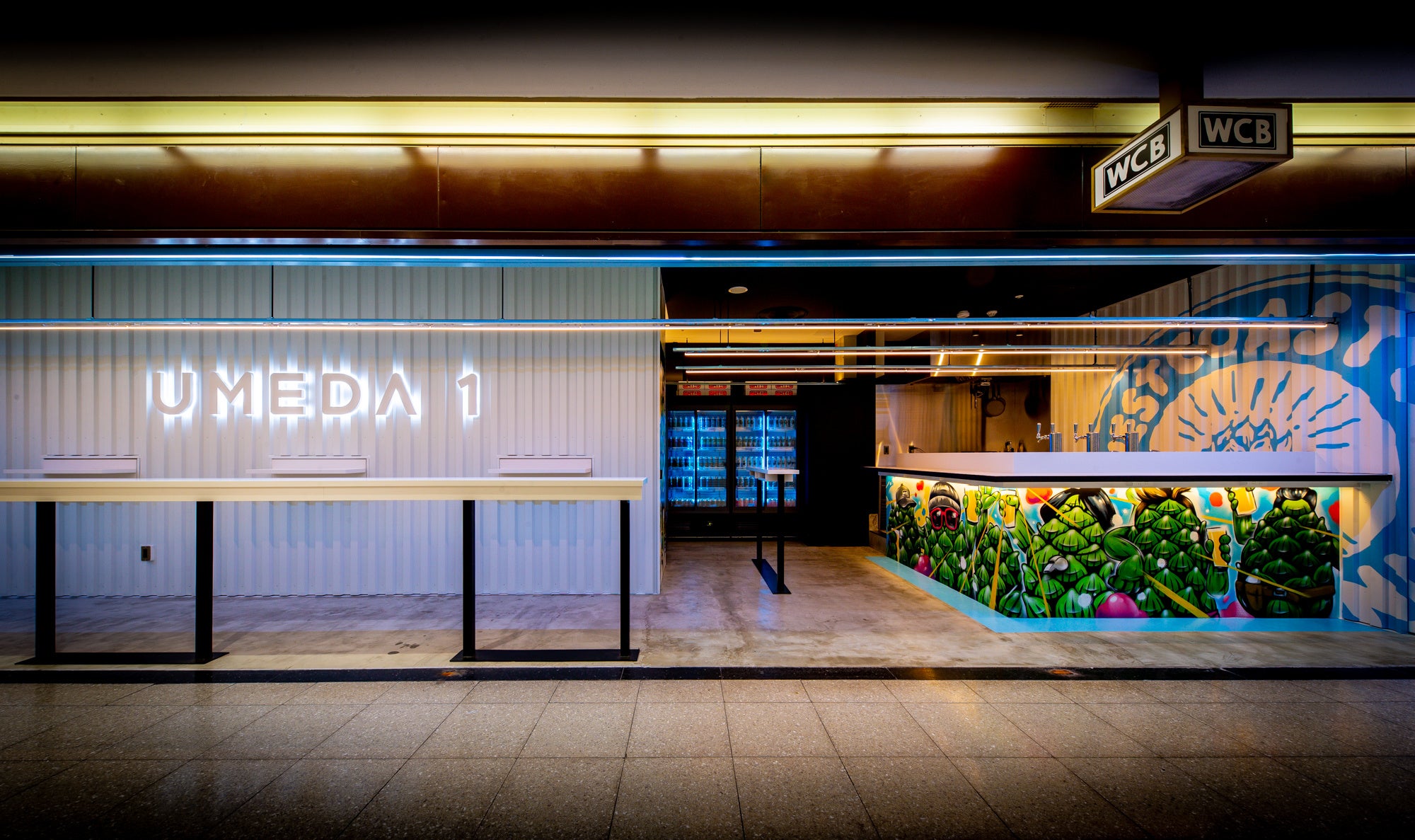 静岡の店舗を筆頭に独自の世界観を築くWCBの直営店だが、大阪の2店舗も同様に、WCB代表であり建築家のバストン・デレックがデザインを手掛けている。ダークサイドをテーマに、とことんダークな店づくりを突きつめ、バー要素の強い心斎橋と対照的に、梅田はライトサイドをテーマに爽やかなカラーリングが目を引く、角打ちスタイルのカジュアルなスタンディングバーに。代表デレックの故郷・アメリカ西海岸と日本の2か国を融合させたスタイリッシュな店内には、WCBの缶ビールラベルに登場するオリジナルキャラクター"Hop Dude”たちの世界が広がり、関西在住のアーティストがスプレーアートで描いた。