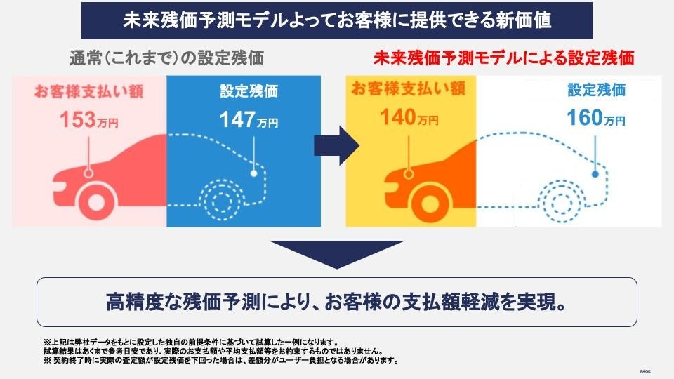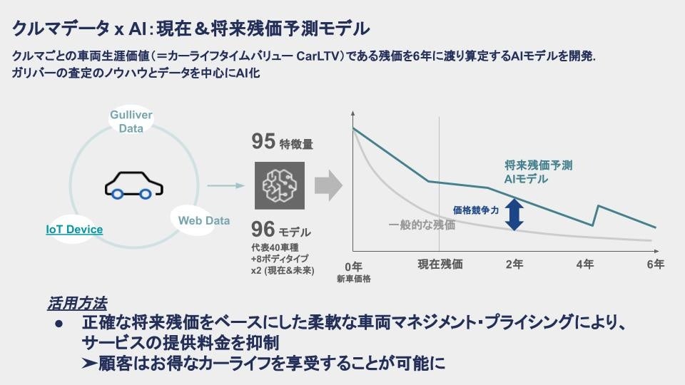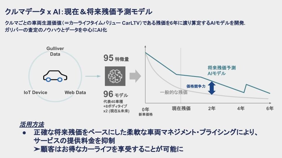 このモデルではクルマごとの車両生涯価値、通称カーライフタイムバリュー(CarLTV)の算出において最も重要な構成要素である残価を6年にわたり高精度に算定し、その結果を元にお客様に様々な新価値を提供します。