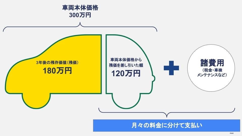 例えば新車価格で300万円の車両を3年間のカーリースを契約する場合で、3年後に180万円の価格がつくという予測がされていたとすると、新車価格の300万円から残価の180万円を差し引いて、120万円を月々の料金に分けて支払うことになります。