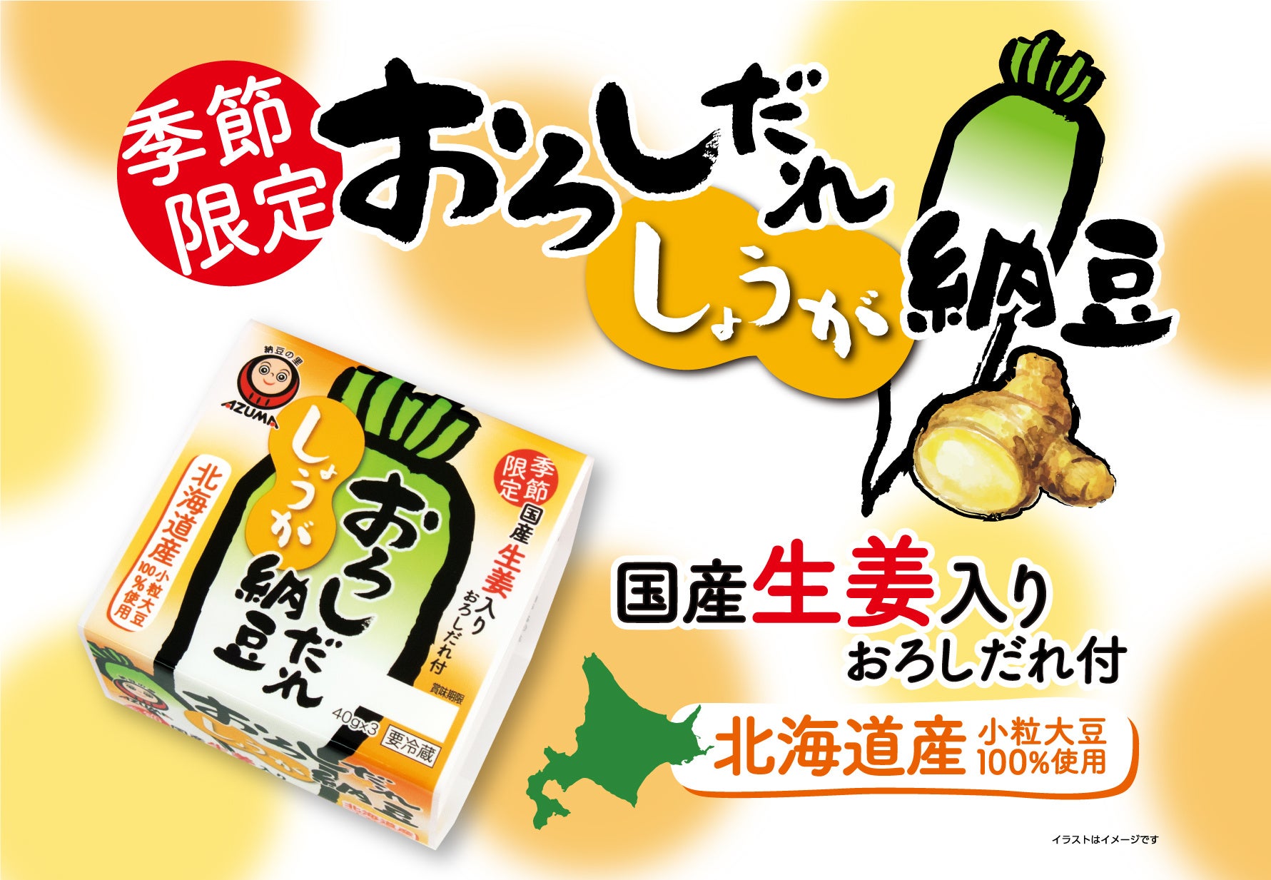 納豆ひとすじ72年、あづま食品株式会社(本社:栃木県宇都宮市、代表取締役社長:黒崎英機)は、季節限定の新商品「おろしだれしょうが納豆」を9月1日より販売いたします。