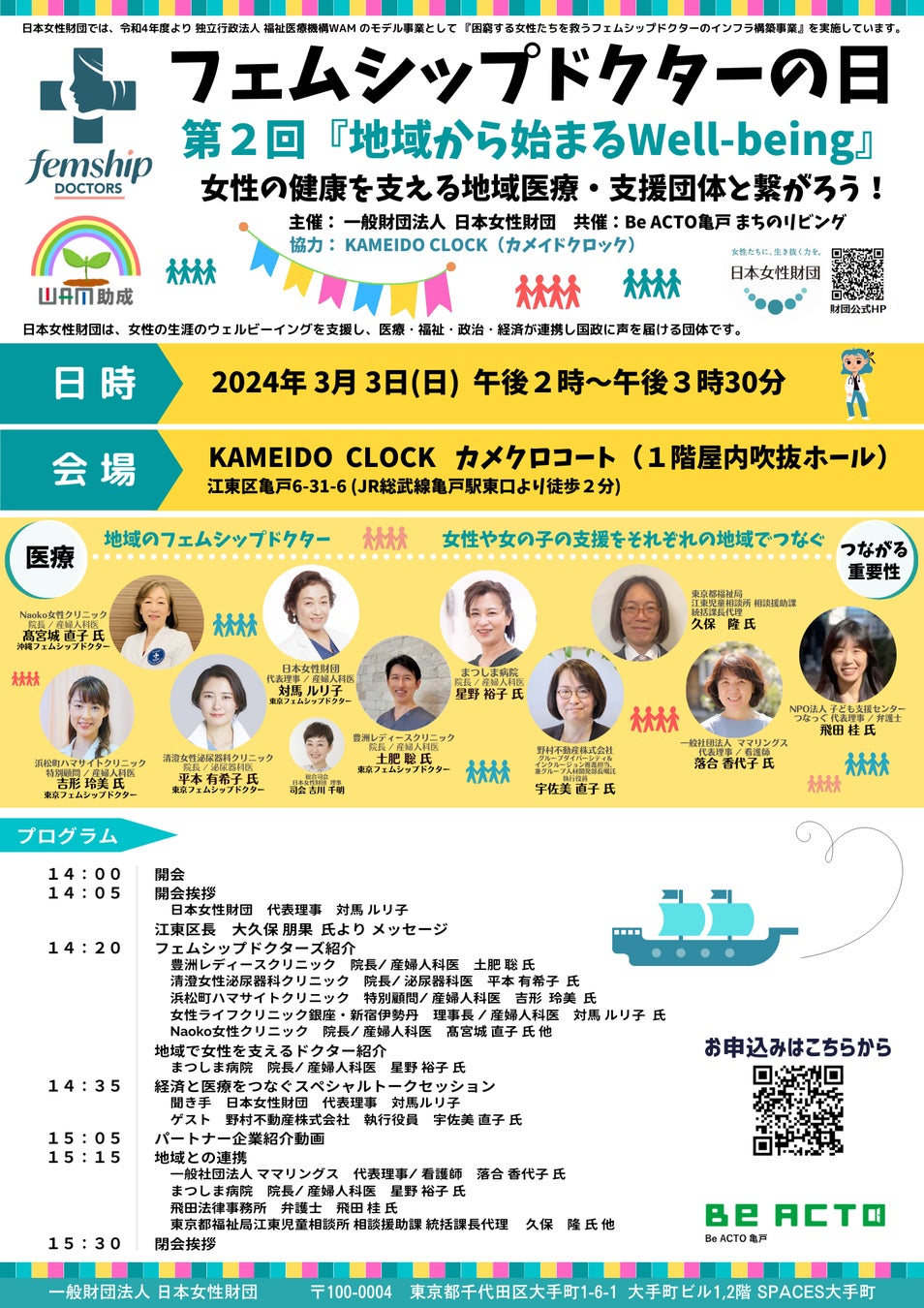 一般財団法人日本女性財団(本社:千代田区大手町、代表理事:対馬ルリ子、以下 日本女性財団)は、社会的な健康課題を抱えた女性たちを支援する医療職者や団体、行政、まちづくりに取り組む企業との地域連携を深め、その存在を地域住民に周知するためのイベント「フェムシップドクターの日」を以下の通り開催します。