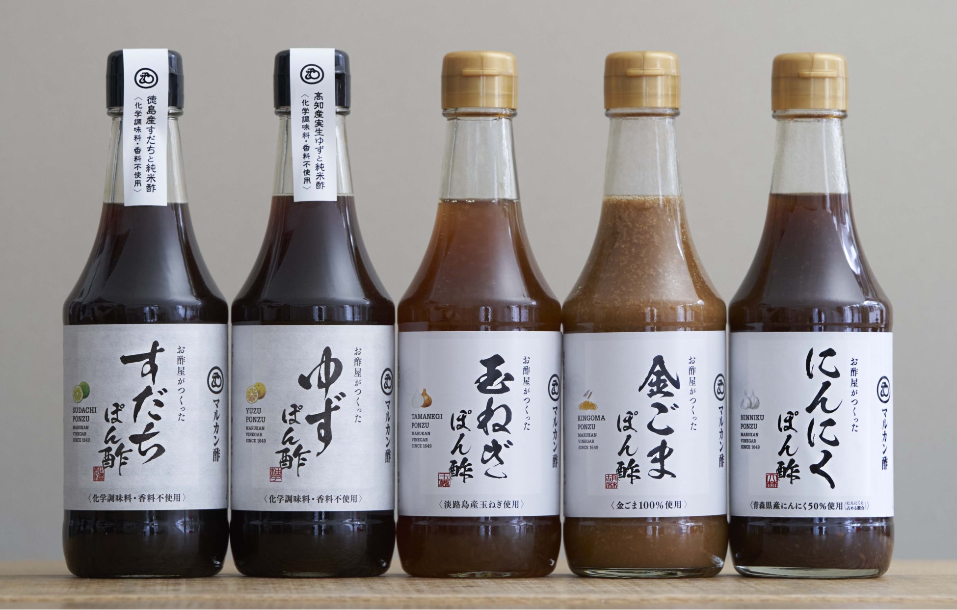「お酢屋がつくった すだちぽん酢」、「お酢屋がつくった ゆずぽん酢」、「お酢屋がつくった 玉ねぎぽん酢」「お酢屋がつくった 金ごまぽん酢」、「お酢屋がつくった にんにくぽん酢」 内容量:300ml価 格 :540円(税込)