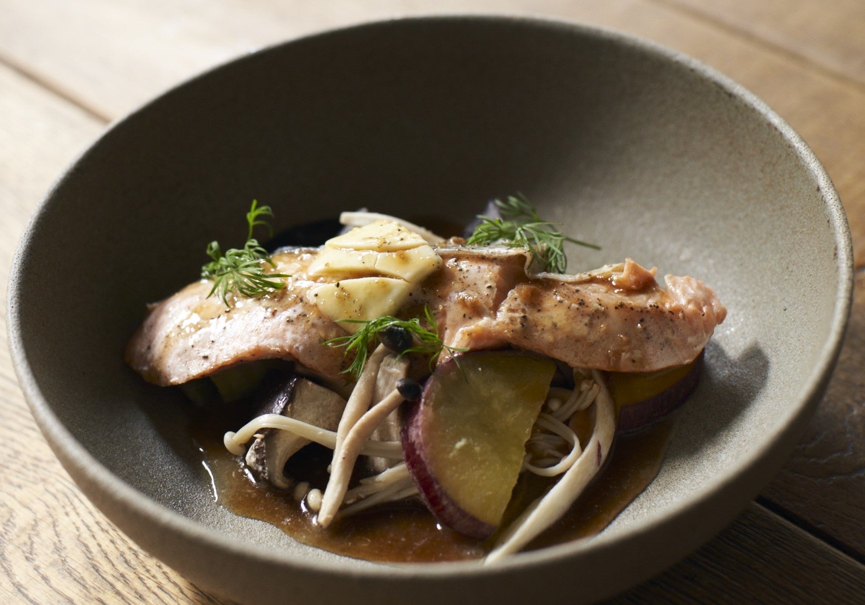 サーモンときのこの旨みや、さつまいもの甘さが、ぽん酢のにんにく風味によく合う一品。仕上げのバターが全体をまろやかな味で包みます。