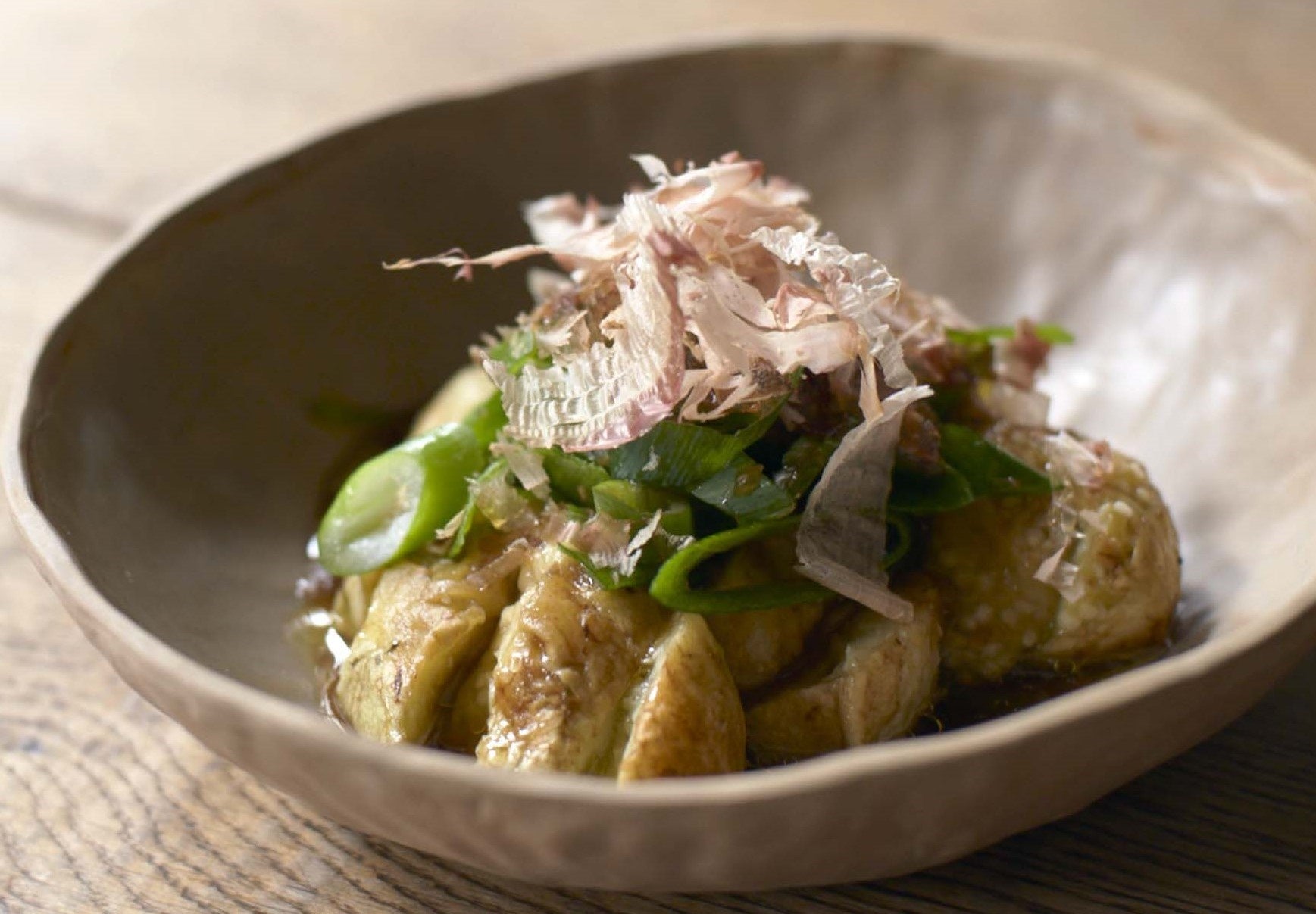 香ばしく焼いた茄子と、にんにくの風味との相性が抜群な一品です。にんにくぽん酢と混ぜ合わせたオリーブオイルが、更に風味や味わいを引き立たせます。