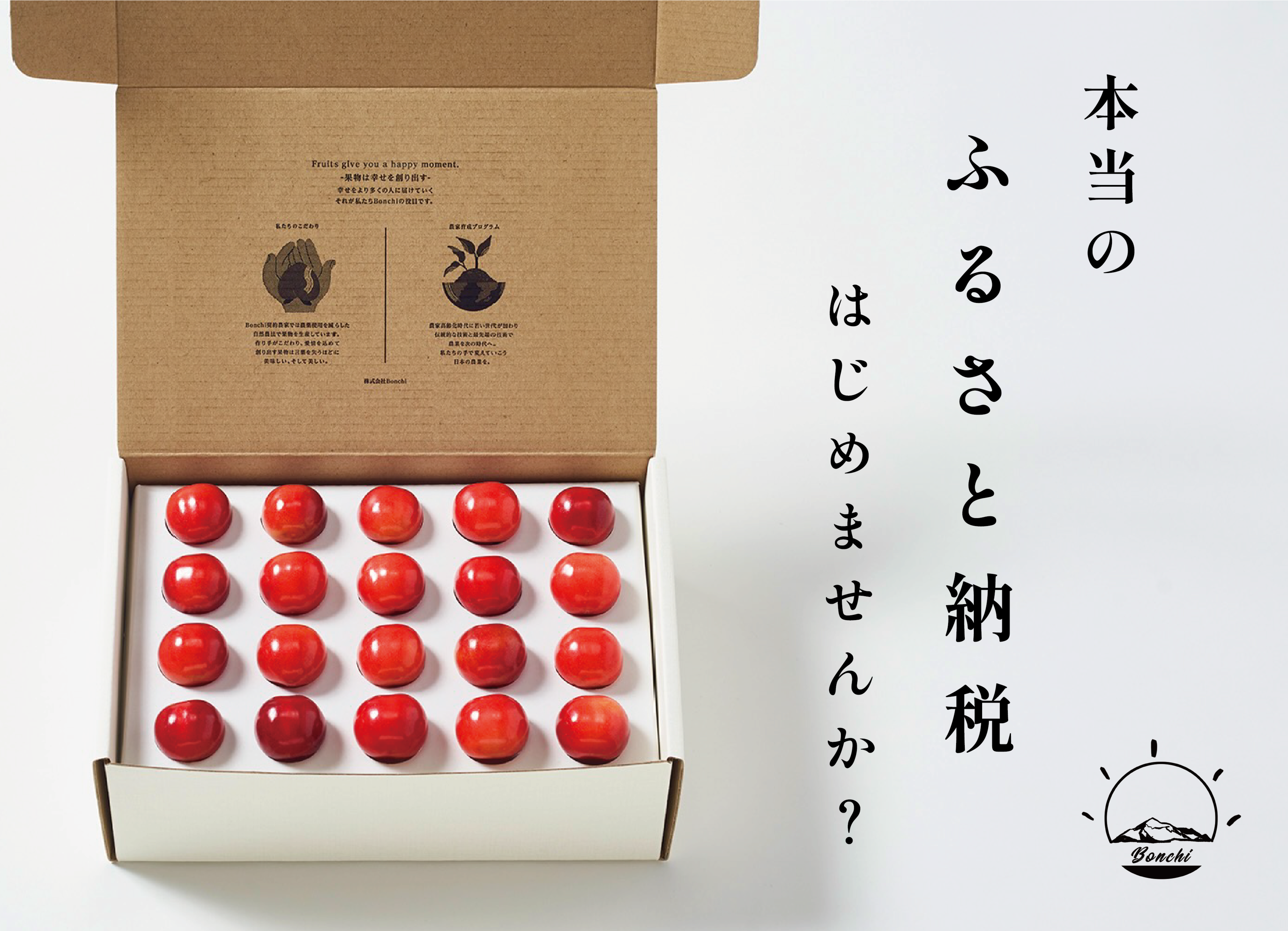 株式会社Bonchi(本社:山梨県南アルプス市、代表取締役社長:樋泉侑弥)は、果物専門産地直送オンラインストア「Bonchi 」にて、農業の社会問題を解決し、持続可能な農業の未来を創るため新しい果物の買い方を提案。同時に5月下旬頃より食べ頃を迎える山梨県産大粒さくらんぼの注文受付も開始します。甲州市、南アルプス市にてふるさと納税でも購入可能。