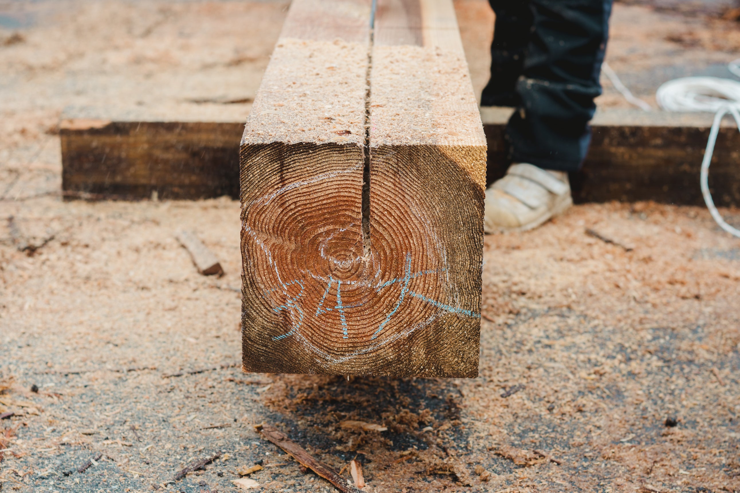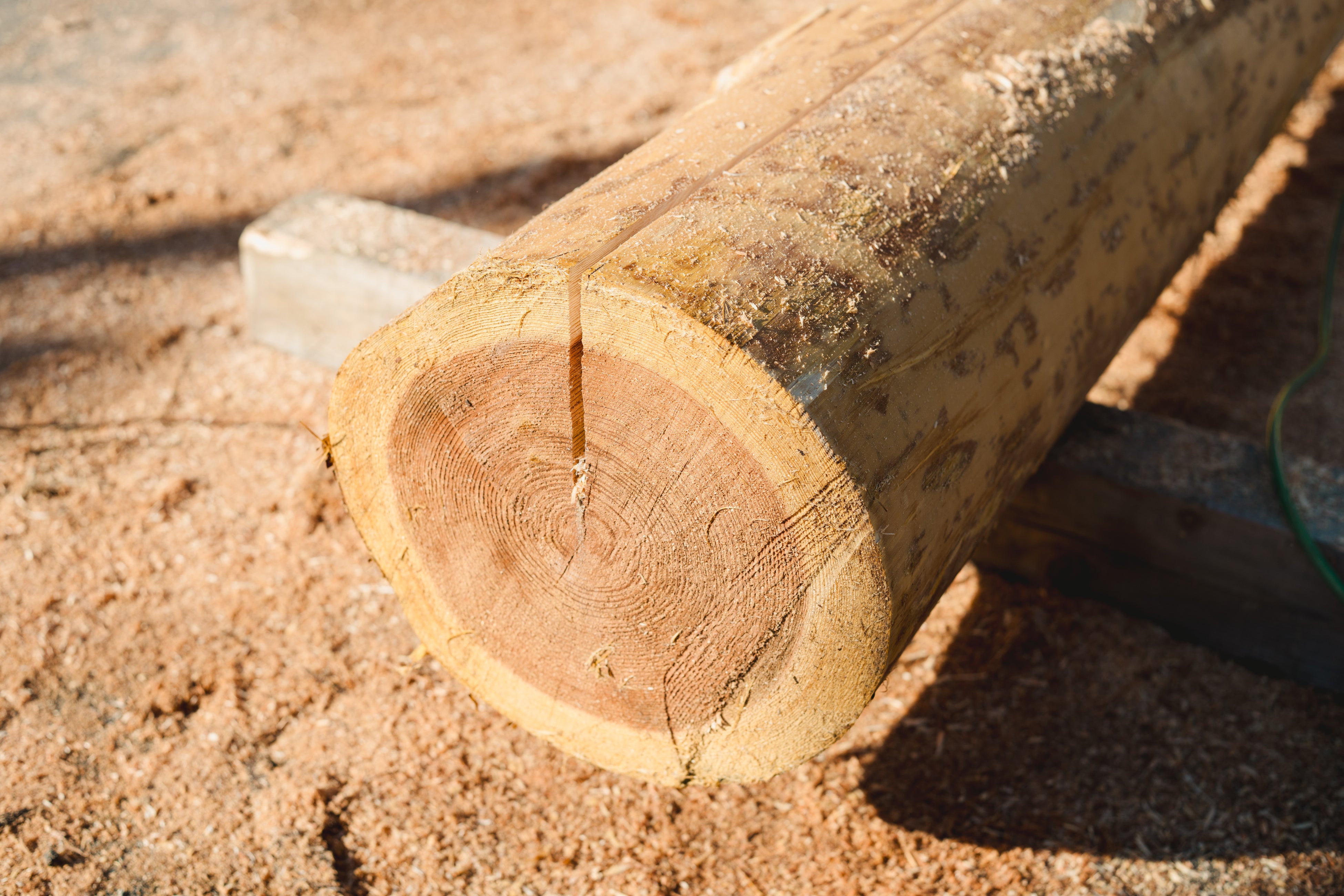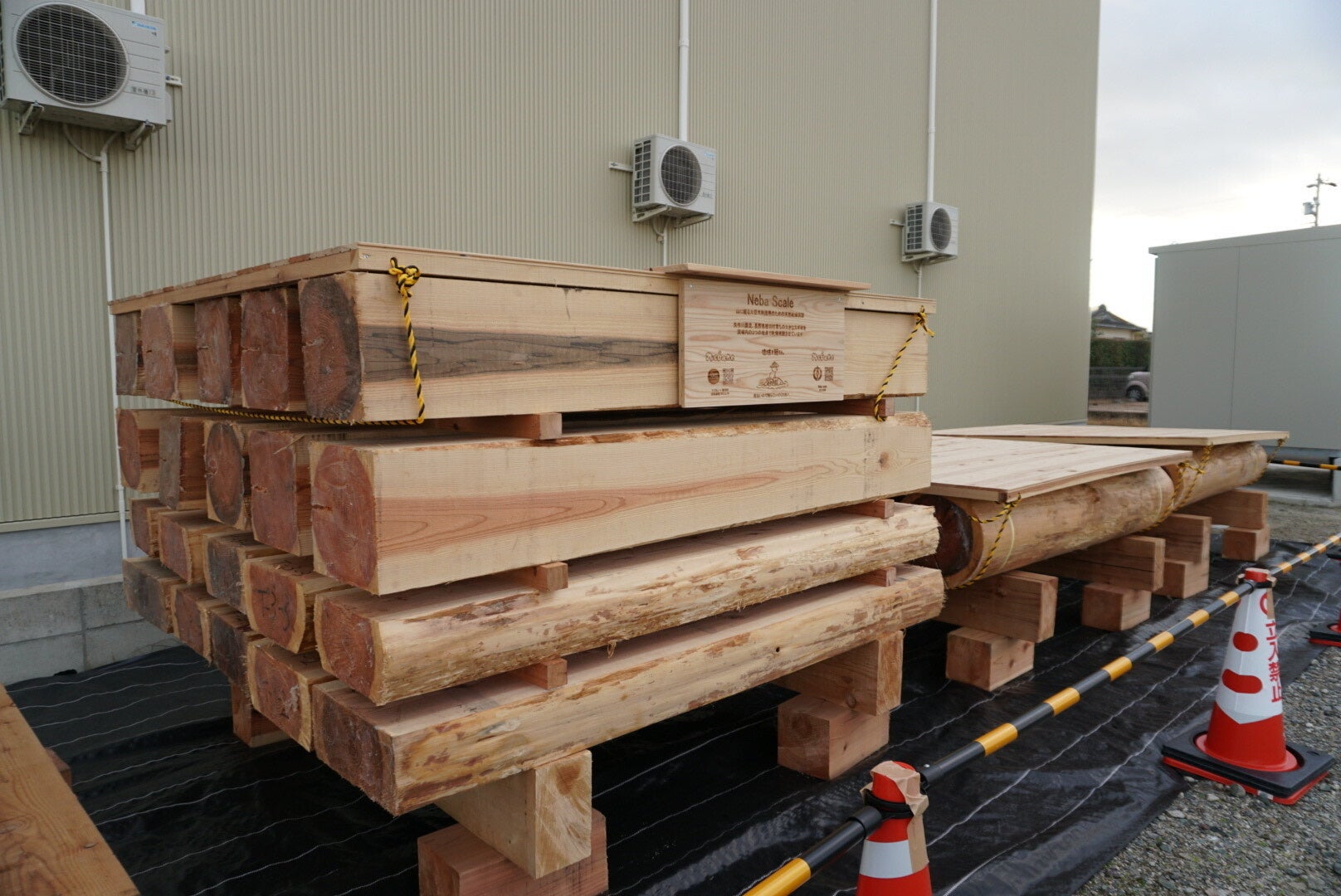 人工乾燥に頼らない、新たな木材活用。建築用材としての実用化を目指し、正角・太鼓・丸太の3種の形状で大径材の天然乾燥比較試験を根羽村森林組合が実施