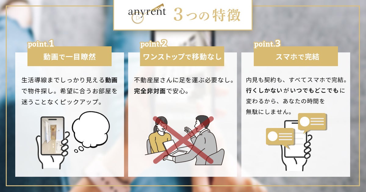 anyrentは業界初の、全ての物件をワンカット風動画でルームツアーできるサービスです。また、物件選び~契約まですべてのフローが、スマホ1つで完結するオンライン賃貸サイトです。