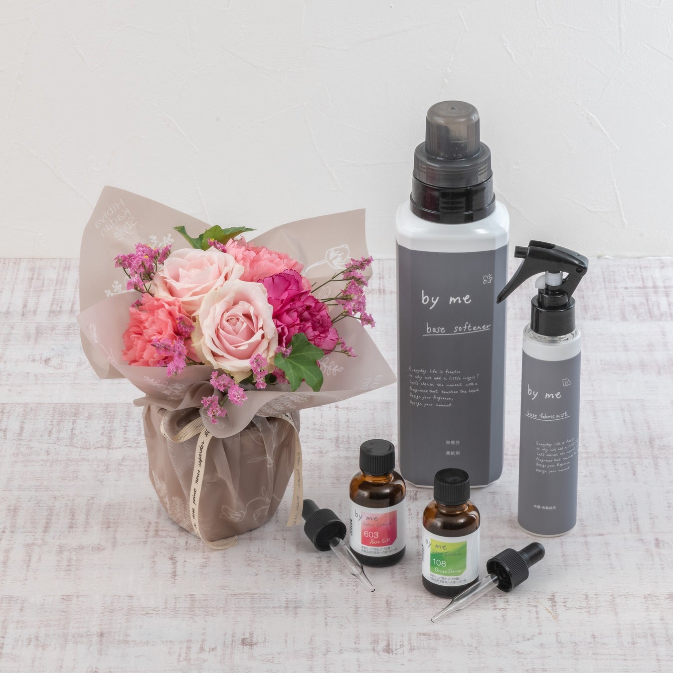 今回、販売するコラボレーション商品は、『by me』のベースソフナー(衣料用柔軟剤)とベースファブリックミスト(布製品に香りづけを行うスプレー)の「香りのないベース」と日比谷花壇がセレクトしたフローラル調の香りのエッセンス2種をセットにした“香りのスペシャルギフト”に、“そのまま飾れるブーケ”を組み合わせた、この期間にしか購入できない特別限定品です。