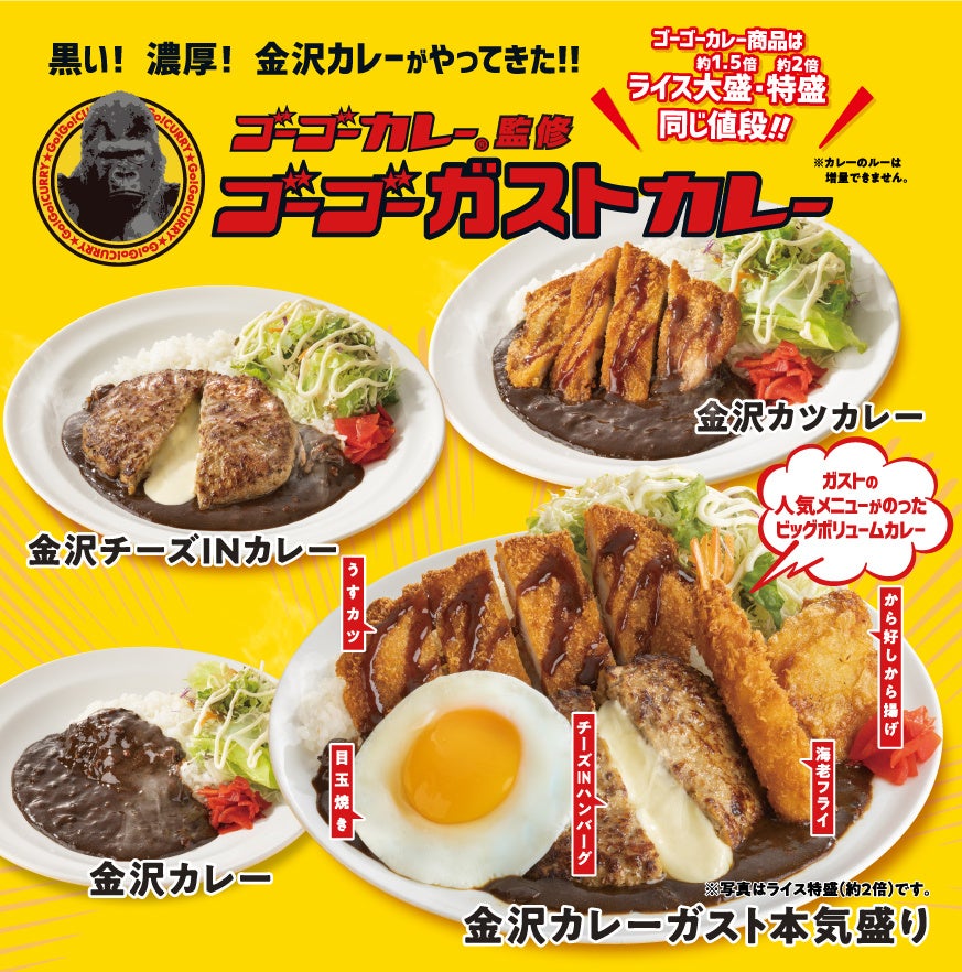 「金沢カレーブーム」の火付け役のゴーゴーカレーが監修する、濃厚でドロッとした、甘みのある黒いルーに、ガストの人気NO.1メニュー「チーズINハンバーグ」や唐揚げ専門店「から好し」のから揚げなど5つのトッピングがのったビッグボリュームカレー「金沢カレーガスト本気盛り」(税込1,300円)や、ロースカツがトッピングされた金沢カツカレー(税込 900円)など、4つの「ゴーゴーガストカレー」を提供します。期間は2023年7月20日から9月13日まで。