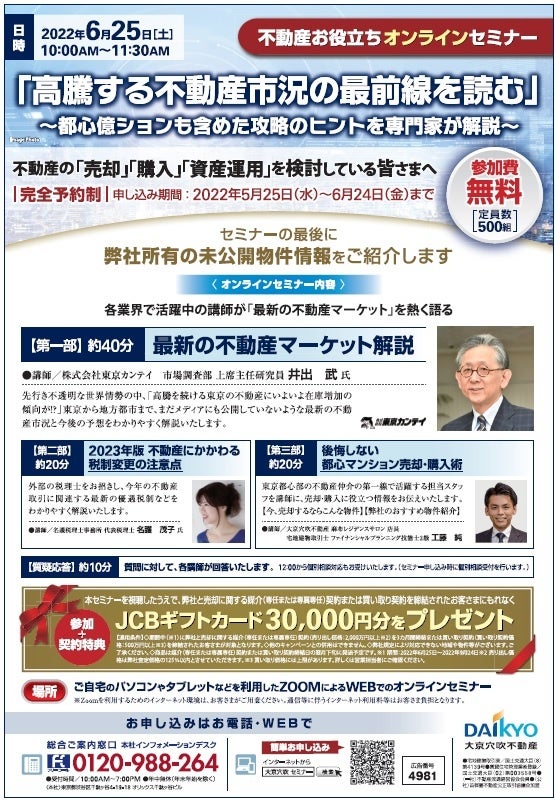 不動産お役立ちオンラインセミナー「高騰する不動産市況の最前線を読む」 ~都心億ションも含めた攻略のヒントを専門家が解説~