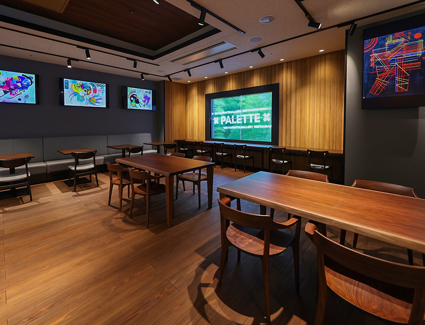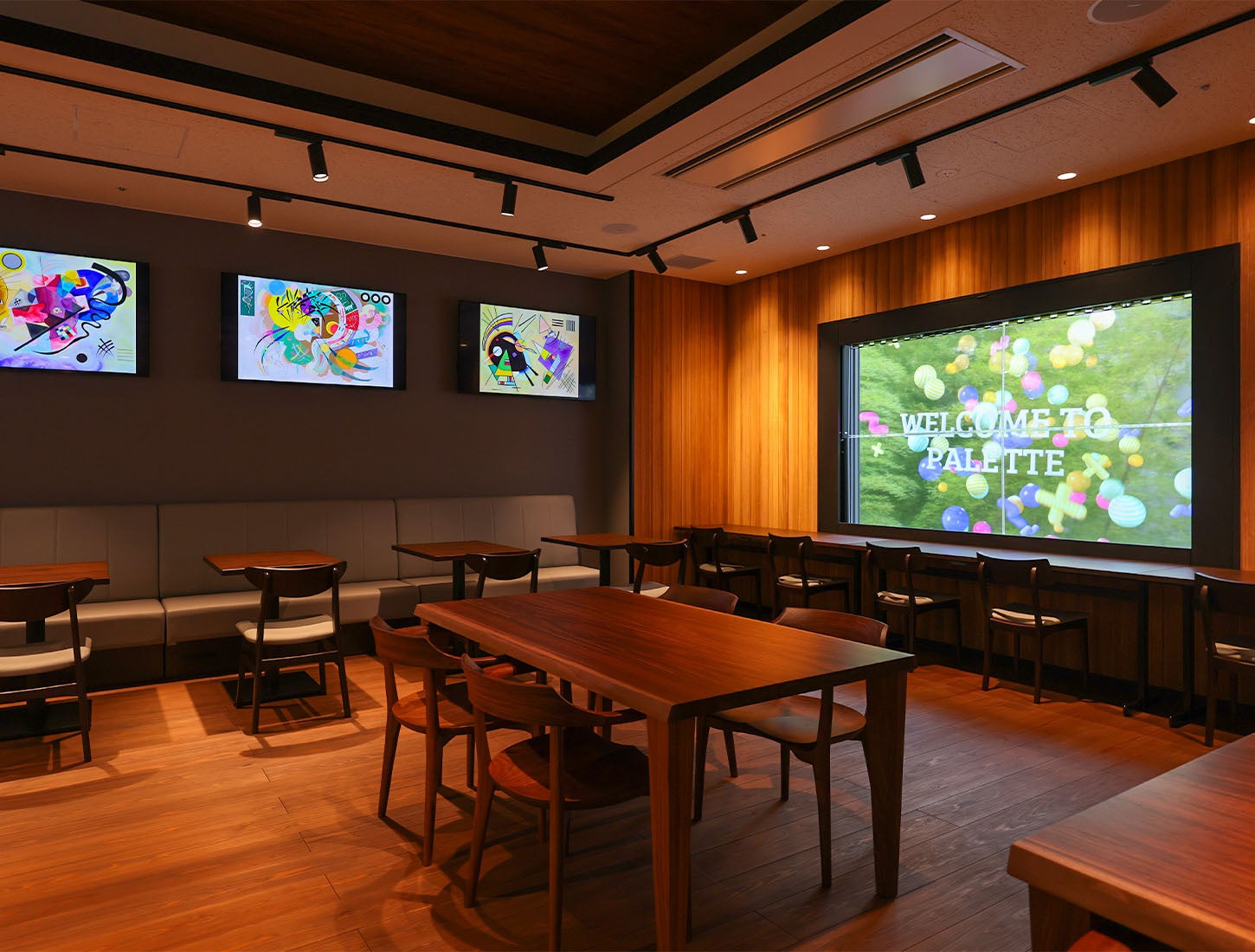 「PALETTE」は2023年10月10日、かながわサイエンスパーク内に新規オープンいたしました。FOOD×ART×RELAXをテーマに、最新のデジタルサイネージと環境にやさしい木製品をふんだんに用いた特別な空間をご提供いたします。おいしい料理と美しいデジタルアート、そして木の香りを楽しむ贅沢なひとときをお過ごしください。店内は木製を基調とした温かみのある内装とし、飲食店では日本初導入(2023年9月自社調べ)となる110インチ透過型有機ELマルチディスプレイのほか、大迫力の8面マルチディスプレイなどの様々なディスプレイに映し出される、デジタルアート、スポーツ、風景などでRELAXとSURPRISEが体験できます。