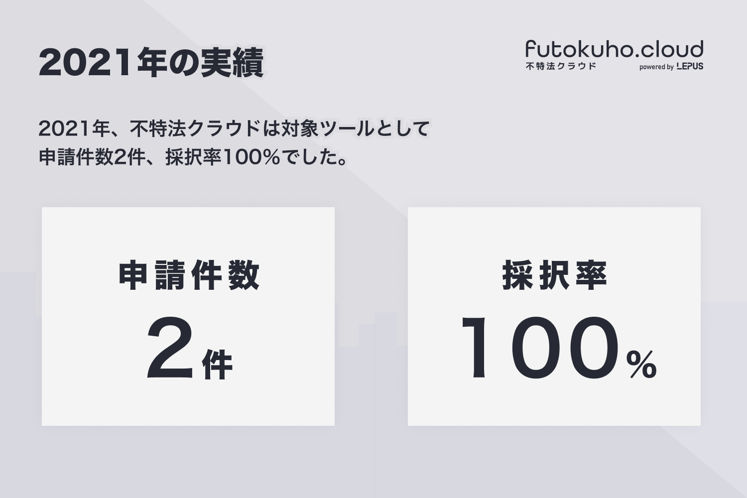 不特法クラウドは2021年、不特法クラウドは対象ツールとして申請件数2件、採択率100%でした。