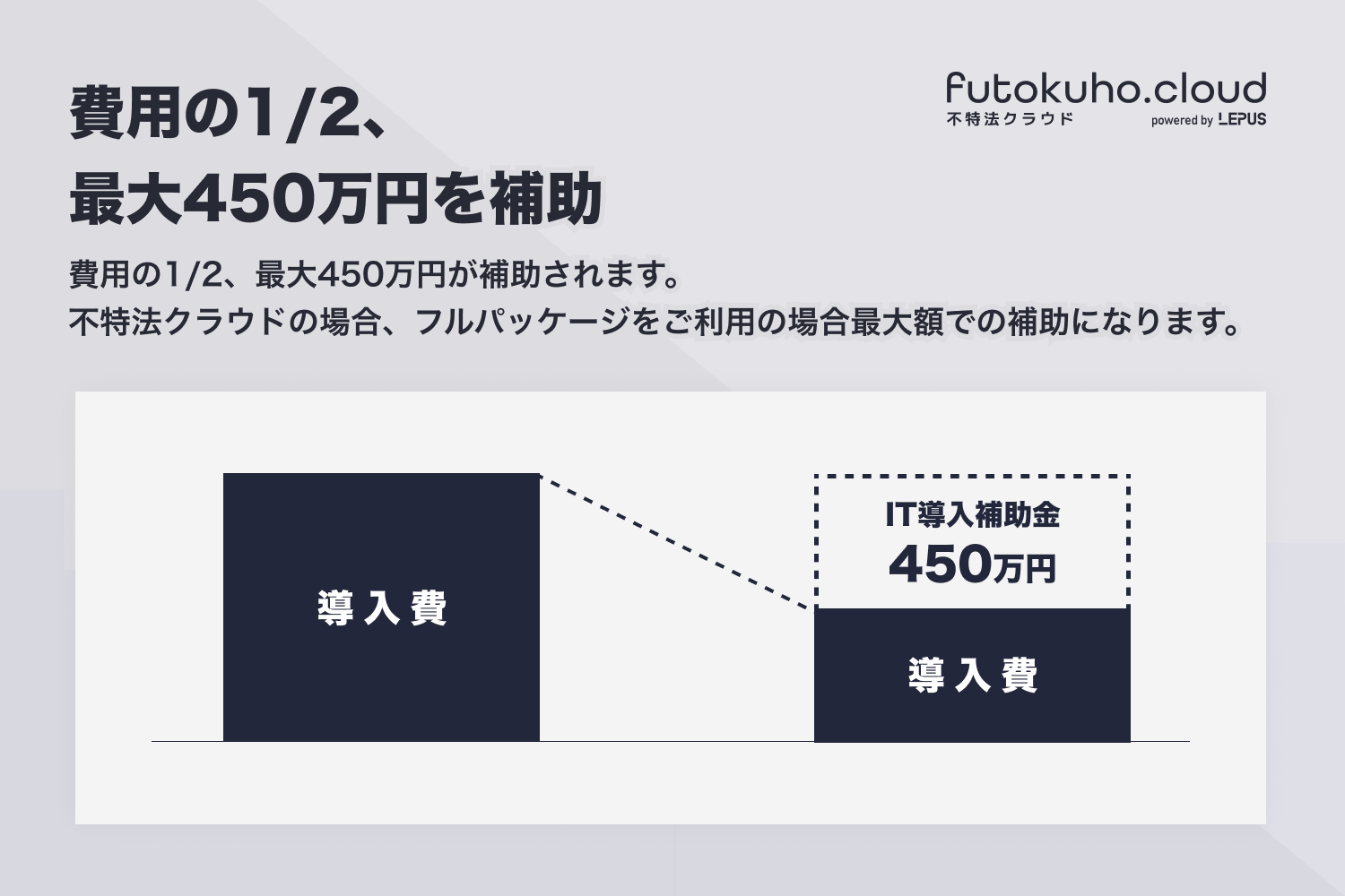 『IT導入補助金2022』を活用することで、『不特法クラウド』の導入にあたり、導入費用の2分の1(最大450万円)の補助が受けられます。
