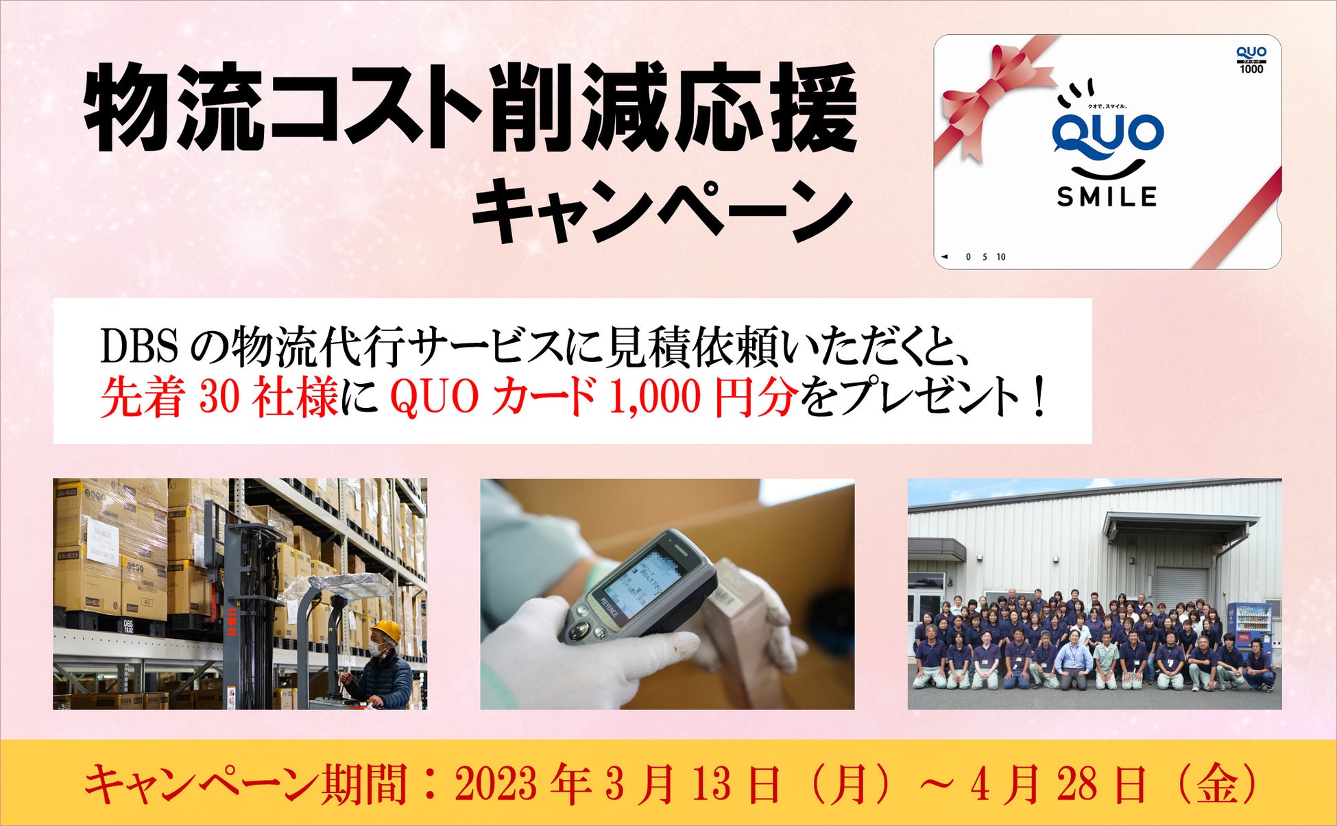 2023年3月13日(月)~4月28日(金)までに新規でDBS物流代行サービスの見積依頼をいただいた方を対象に、先着30名様にクオ・カード1,000円分をプレゼント!