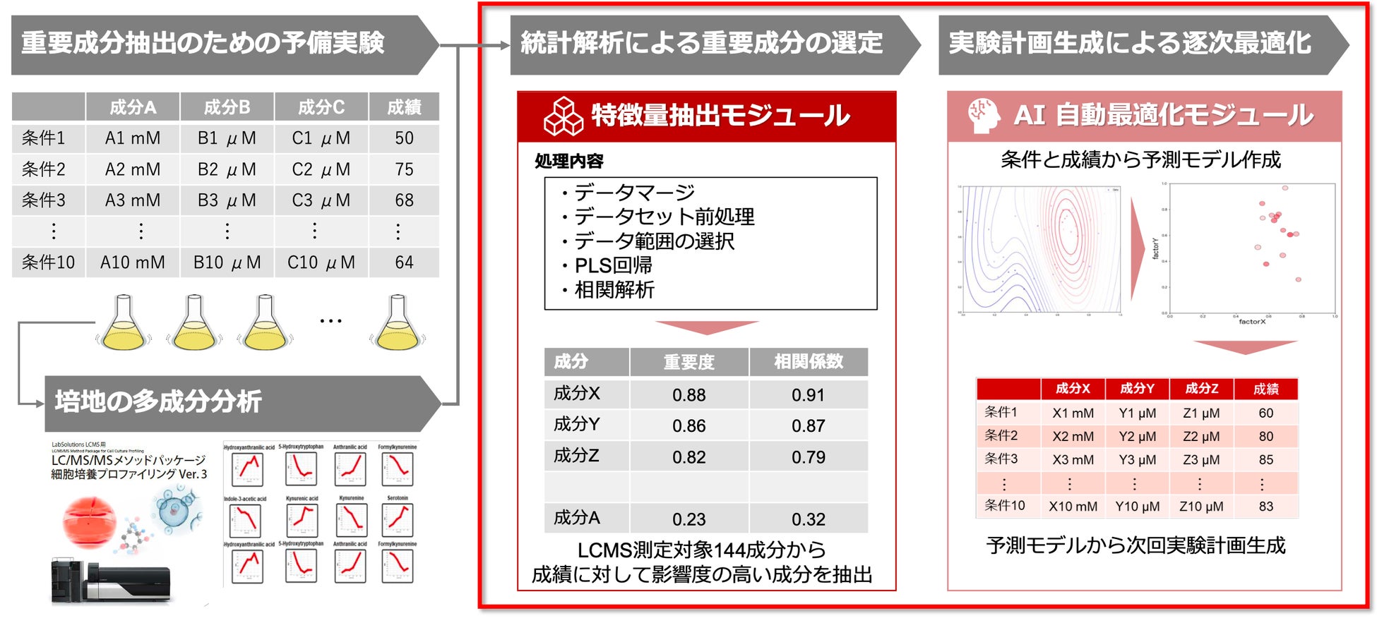 こうした課題を解決するため、エピストラと島津製作所は2022年2月より協業を開始し、島津製作所製LC-MSで計測した培養上清成分(144成分)から、培養結果に大きな影響を与えるパラメータを抽出する特徴量抽出モジュールと、これらの特徴量による最適な培養条件を提案するAI自動最適化モジュール( Epistra Accelerate を使用)から構成される CellTune を共同開発しました。