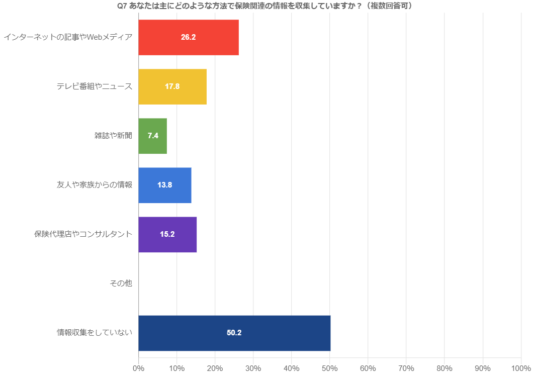 「インターネットの記事やWebメディア」26.2人、「テレビ番組やニュース」17.8人、「雑誌や新聞」7.4人、「友人や家族からの情報」13.8人、「保険代理店やコンサルタント」15.2人、「その他」0人、「情報収集をしていない」50.2人