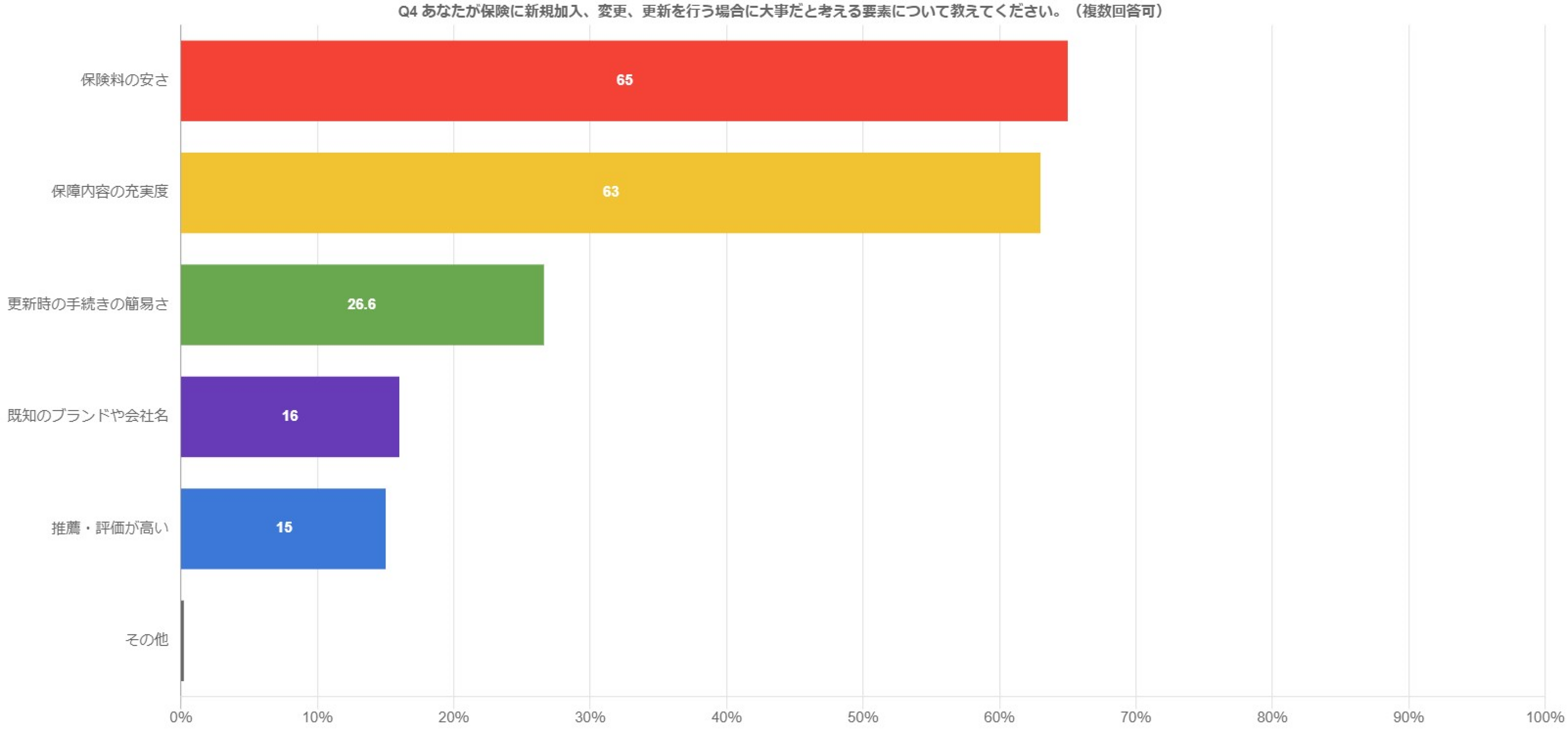 「保険料の安さ」65人、「保障内容の充実度」63人、「更新時の手続きの簡易さ」26.6人、「既知のブランドや会社名」16人、「推薦・評価が高い」16人、「その他」0.2人