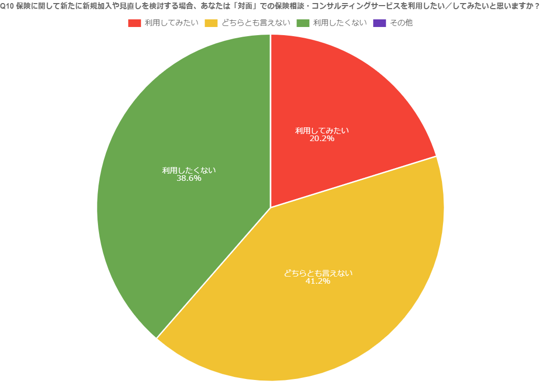 ●全体の約2割が「保険相談・コンサルティングサービスを利用してみたい」、と回答(対面、オンラインいずれもほぼ同数)。