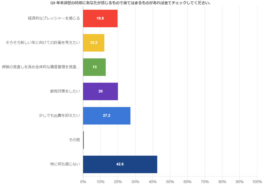 「特に何も感じない」213人、「少しでも出費を抑えたい」136人、「節税対策をしたい」100人、「経済的なプレッシャーを感じる」99人、「保険の見直しを含め全体的な資産管理を見直したい」65人、「そろそろ新しい年に向けての計画を考えたい」61人。