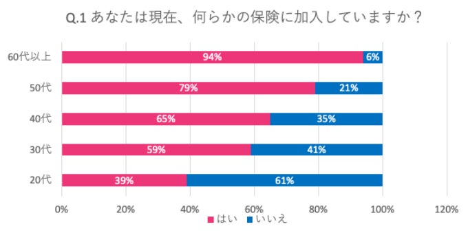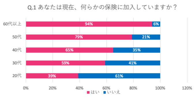 年代ごとの加入比率は異なり、年代が高いほど加入率が高い状況。60代以上の保険加入率94%、50代 79%の一方、20代加入率は39%のみという結果。