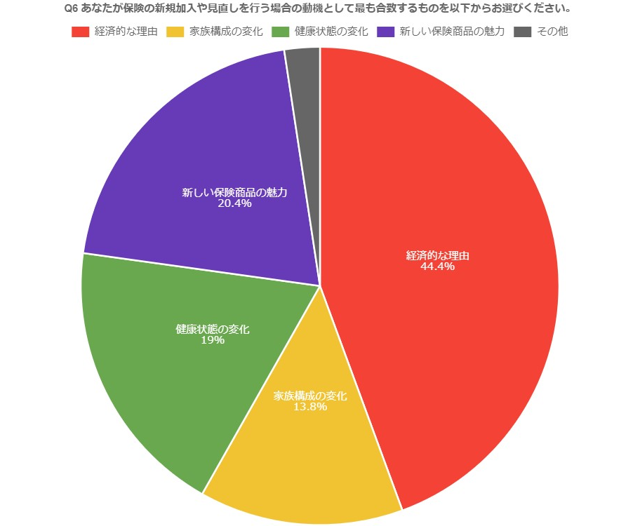 ●保険の新規加入や見直しを行う場合の動機は「経済的な理由」が44.4%、「新しい保険商品の魅力」20.40%、「健康状態の変化」19%、「家族構成の変化」13.8%。