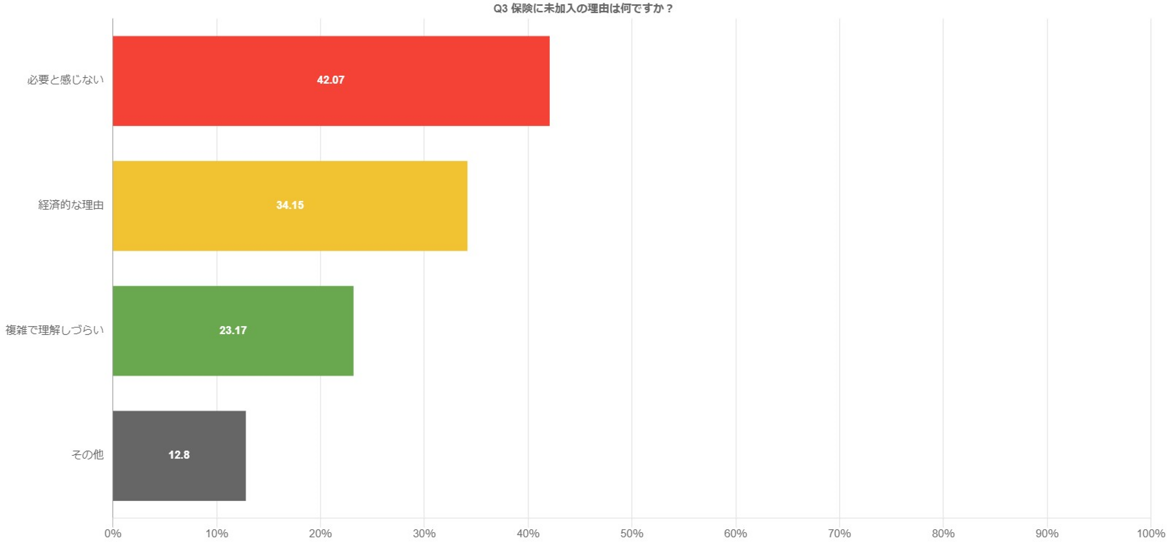 「保険を必要と感じない」と回答した人 42.07人、「経済的な理由」34.15人、「複雑で理解しづらい」23.17人、「その他」12.8人。