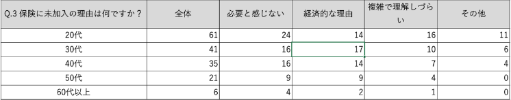 年代別に見ると、年齢が若いほど保険を必要と感じていない状況だが、経済的な理由で未加入なのは20代よりも30代が多いという結果だった。