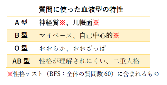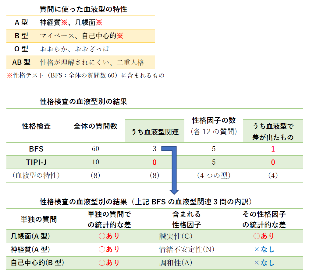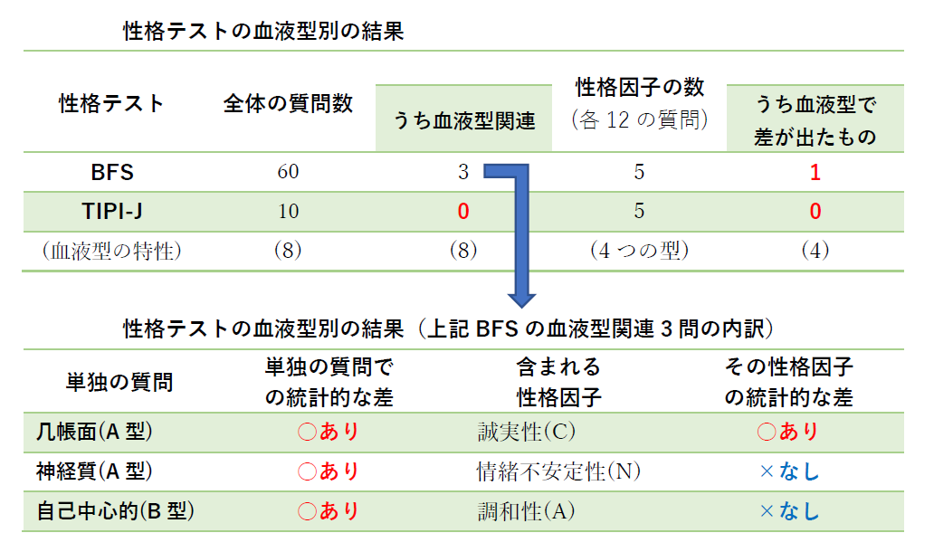 その大きな理由は、現在最も一般的な「ビッグファイブ」性格テストでは、血液型の特性とされる質問がほとんど含まれず、差が現れにくいからのようです。数少ない血液型による差があった質問も、これらを最終的な5つの「性格因子」にまとめる統計処理により、その多くは統計的に意味がないほど小さくなることが確認されました。
